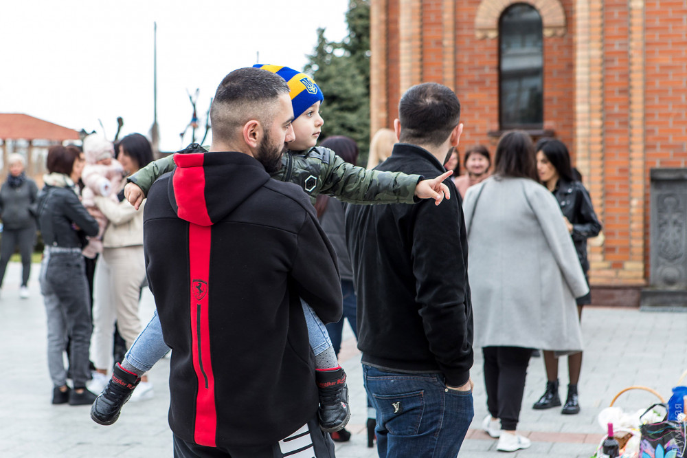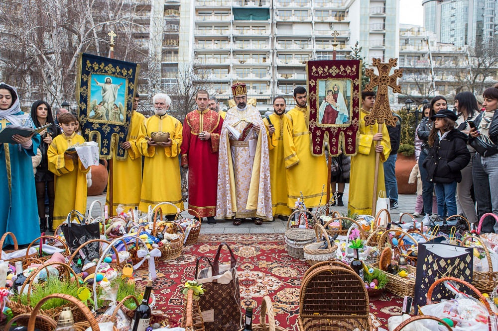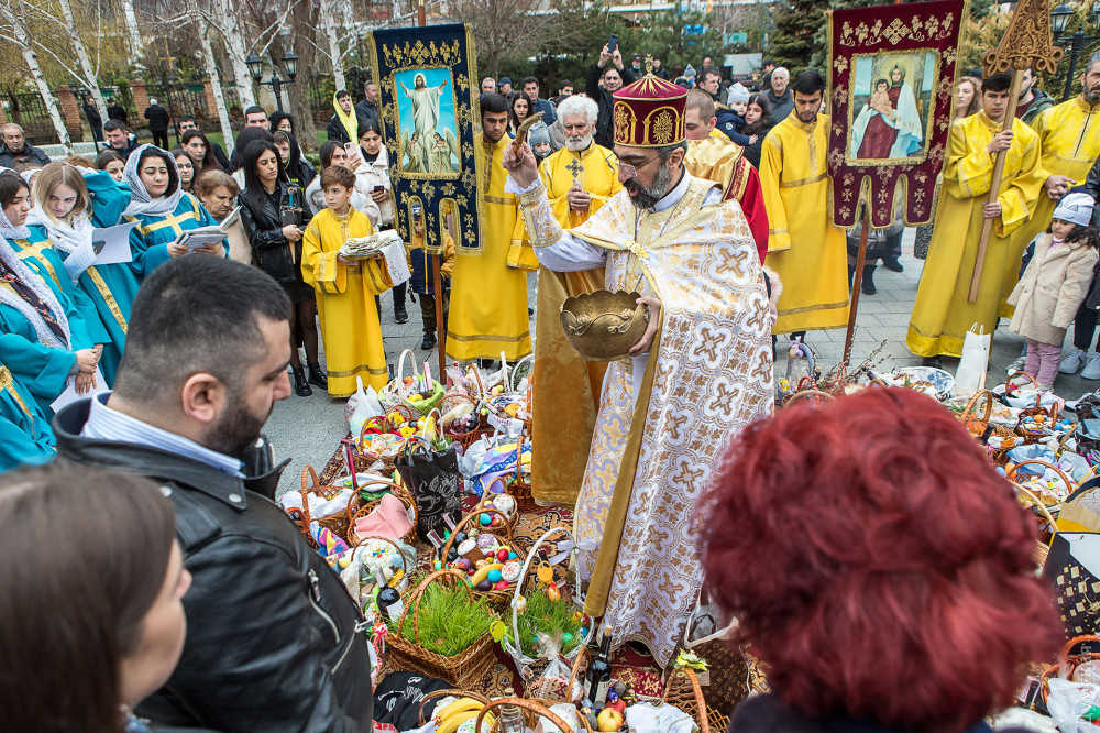 Обряд освящения в армянской общине на Гагаринском плато ввиду карантинных ограничений проходил на открытом воздухе. Прихожане выкладывали принесенные из дома корзинки на ковер у входа в храм. В каждой – крашеные яйца, бутылочка красного вина, фрукты и пасха либо гата (армянский национальный пирог).