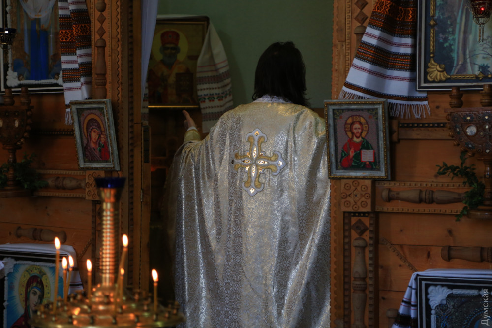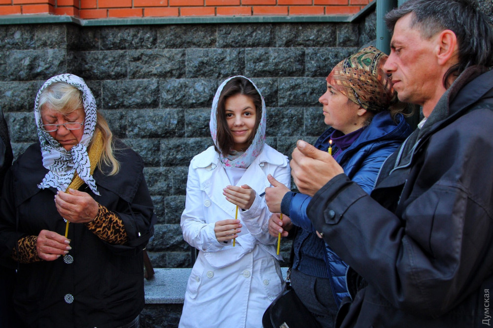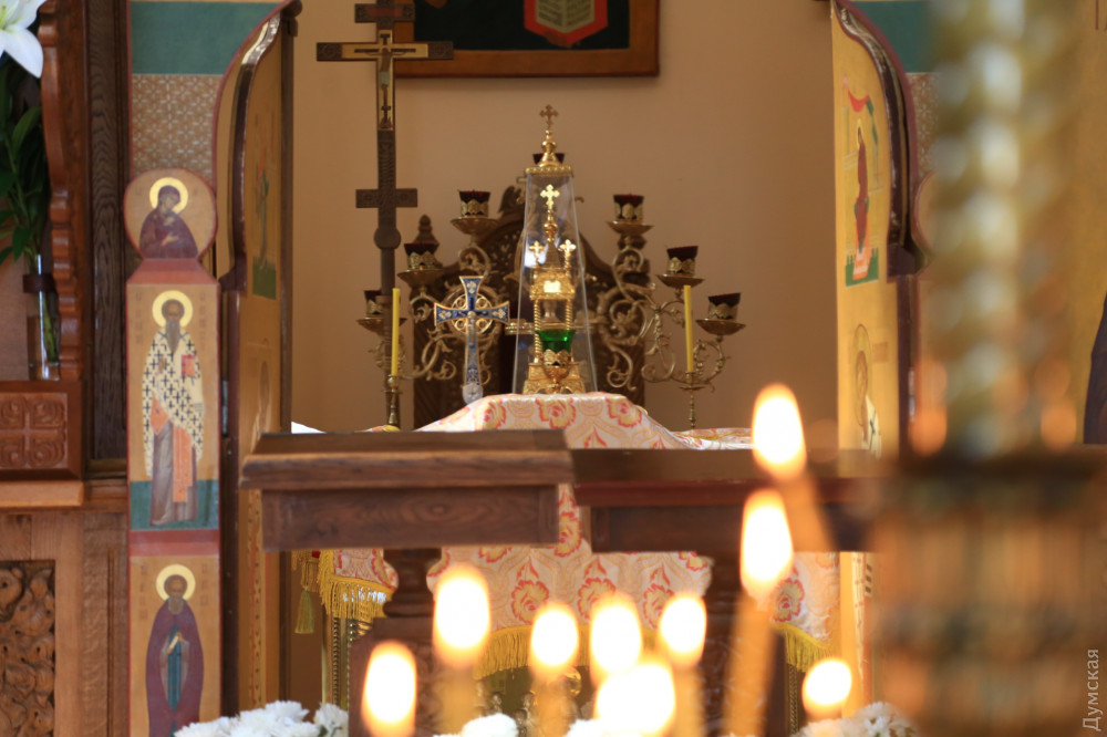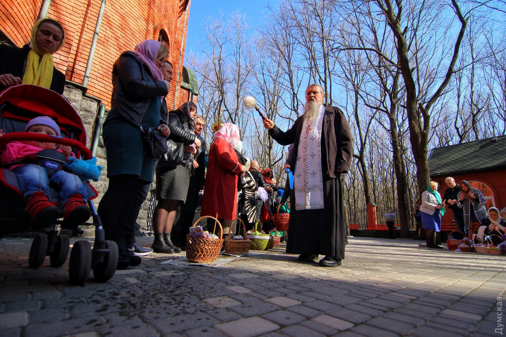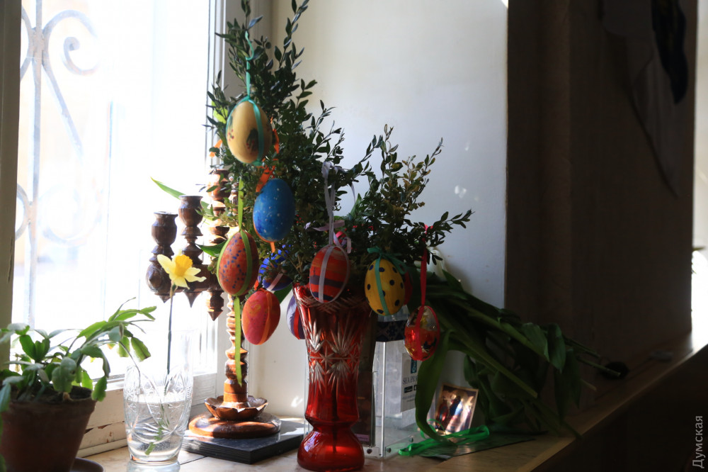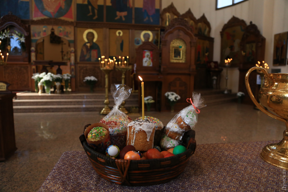 В греко-католическом храме Святого Архистратига Михаила, который располагается в помещении морской миссии на Ланжероновском спуске, все куда скромнее. Зато здесь по-домашнему уютно. На окне стоит комнатное растение, украшенное традиционными писанками. Сквозняк колышет морские флаги. В небольшом зале собралось не более двадцати верующих с пасхальными корзинами. Повторную службу для тех, кто пропустил всенощное бдение, проводит отец Александр Смеречинский — военно-морской капеллан и волонтер.