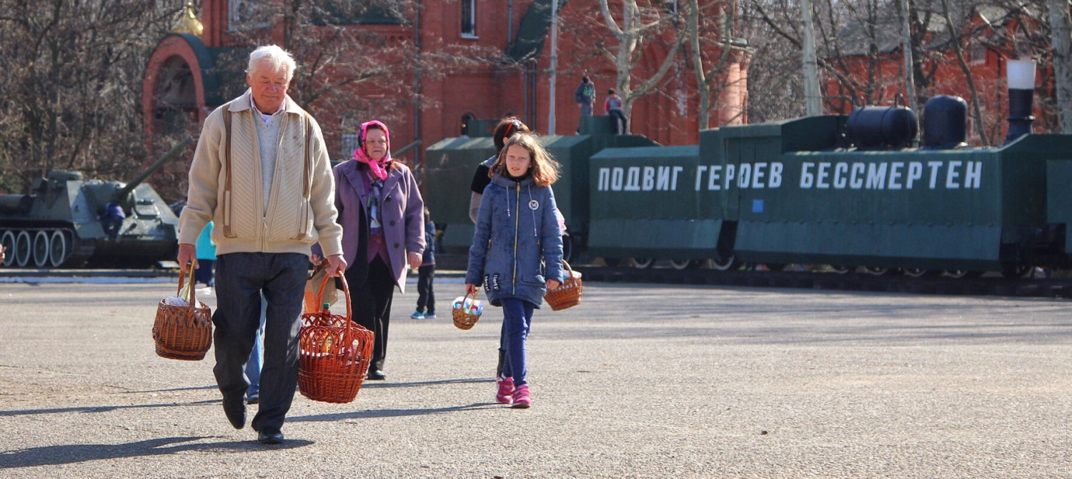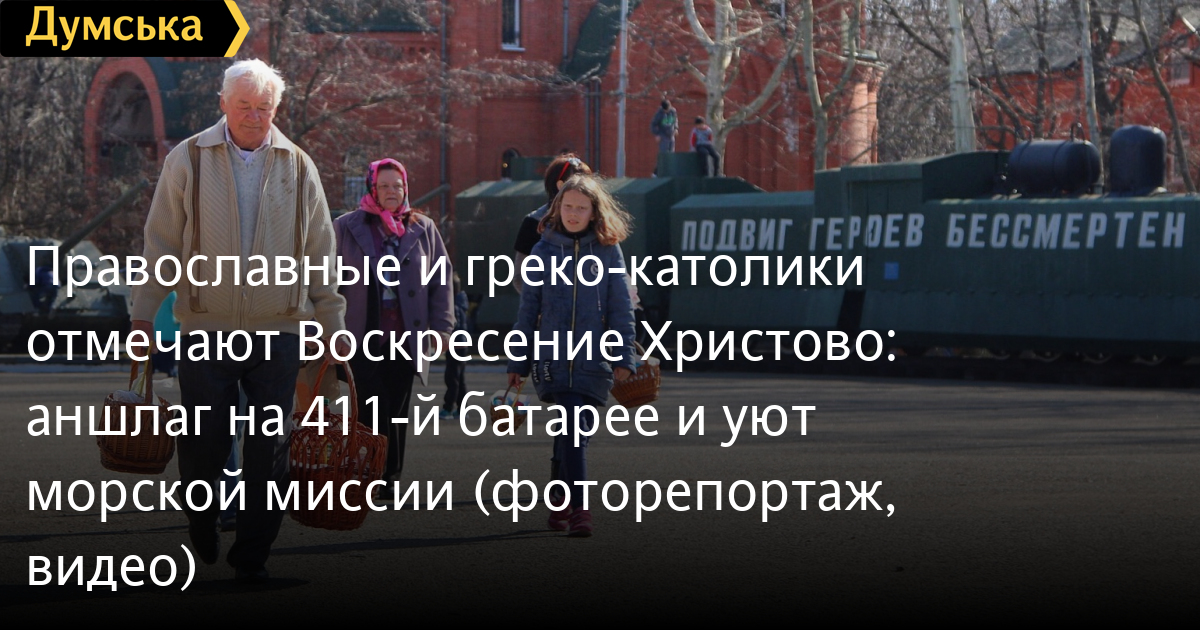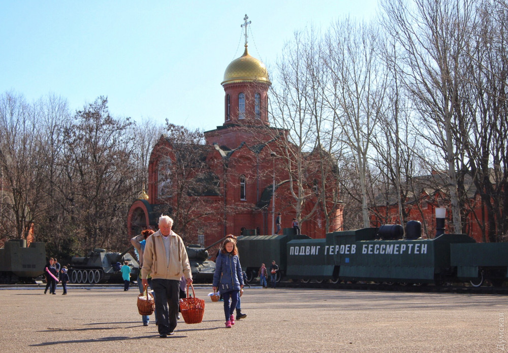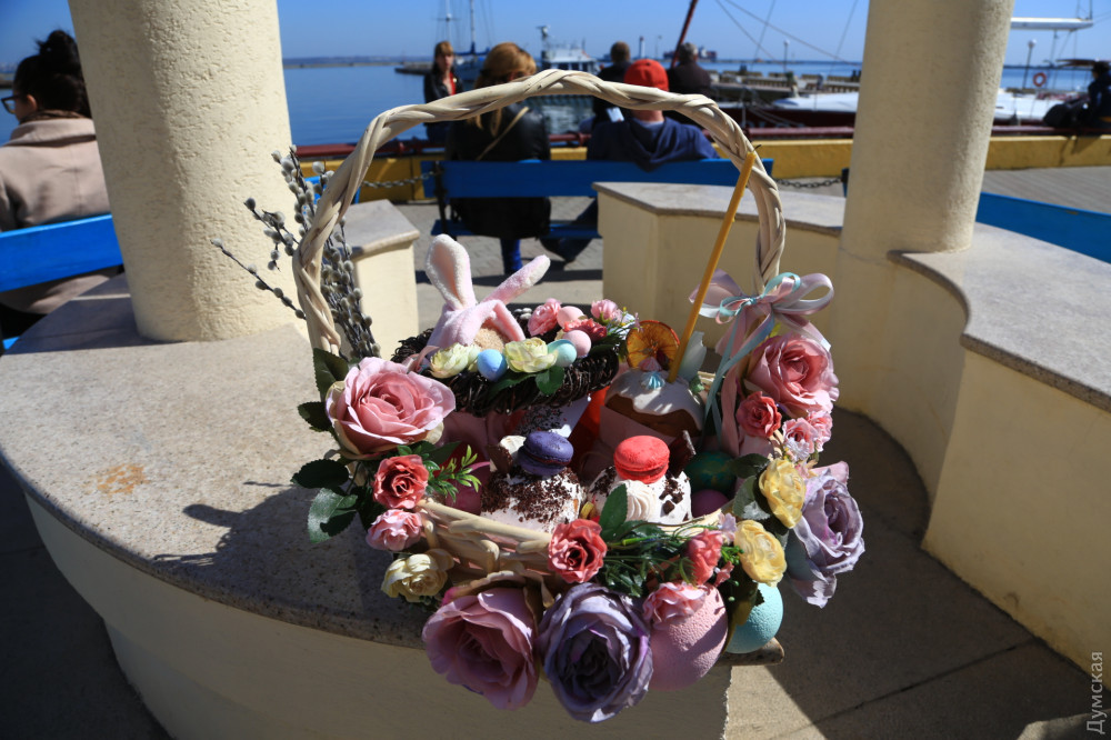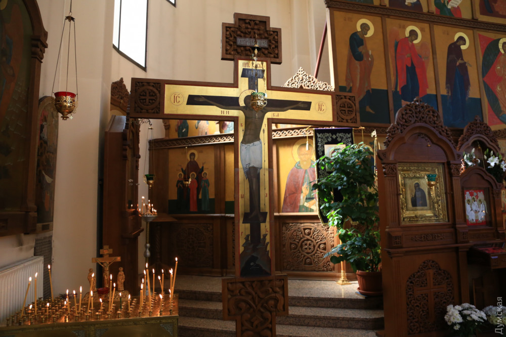 В греко-католическом храме Святого Архистратига Михаила, который располагается в помещении морской миссии на Ланжероновском спуске, все куда скромнее. Зато здесь по-домашнему уютно. На окне стоит комнатное растение, украшенное традиционными писанками. Сквозняк колышет морские флаги. В небольшом зале собралось не более двадцати верующих с пасхальными корзинами. Повторную службу для тех, кто пропустил всенощное бдение, проводит отец Александр Смеречинский — военно-морской капеллан и волонтер.