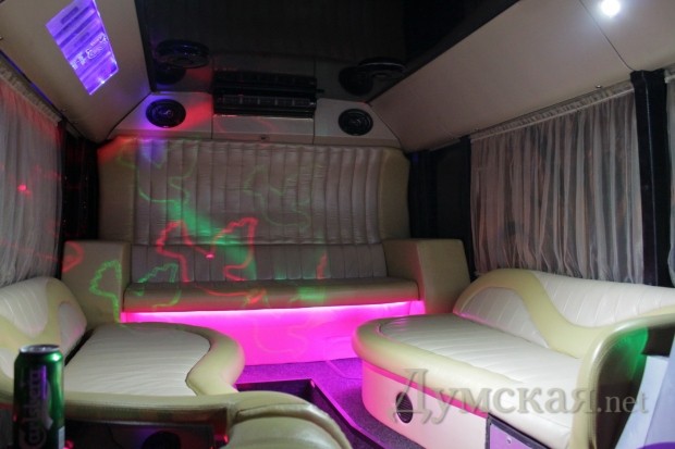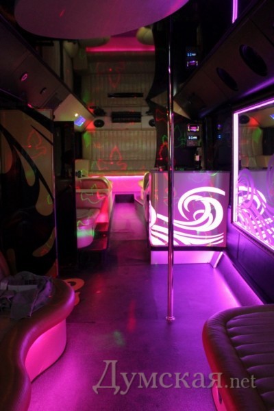 Кожаные диваны, пилон, цветомузыка, Dolby Surround – настоящая дискотека, но… на колесах. Специально оттюнингованый для Одессы, первый в Украине «Патибас» выехал на дороги города, чтобы дать возможность наслаждаться любимой музыкой в приятной компании практически в любой точке Одессы и Украины.