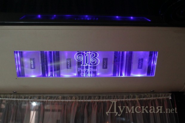 Разместиться в нем могут до тридцати человек. Тут есть все необходимое, что бы провести вечеринку, пати, день рождения – 12 колонок, 2 саббуфера, киловатты звука¸ бар, ди джейская стойка, туалет, кондиционеры. Собрана дискотека на колесах, на основе автобуса «MAN». Водитель отделен от салона перегородкой так, что музыка ему не мешает. И вообще, громкая музыка не прорывается на улицы города — автобус отделан звукопоглощающими материалами.