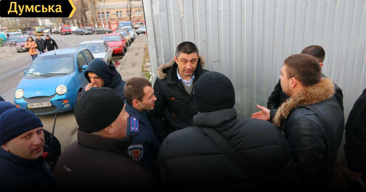 Сотрудники управления торговли Одесского горсовета пытаются снести три торговых павильона на обнесенной забором части Старосенной площади близ корпуса Нархоза.