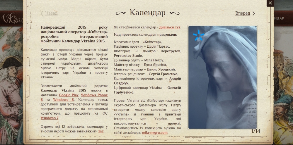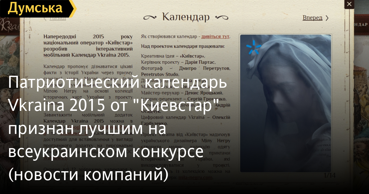 Патриотический календарь Vkraina 2015 от «Киевстар» признан лучшим на всеукраинском конкурсе (новости компаний)12 октября были названы победители конкурса «Ukrainian Design: The Very Best Of». Календарь «Vkraina 2015», который дает возможность установить на свой телефон или планшет патриотические обои, победил в номинации Illustration & Photography. Выставка-конкурс «Ukrainian Design: The Very Best Of 2015» направлен на популяризацию украинского дизайна и уже четвертый год выбирает лучших национальных дизайнеров в разных направлениях. В этом году на конкурс был подан патриотический календарь «Vkraina 2015» от «Киевстар». Как сообщили в компании, общее количество загрузок приложения достигло более 30 тысяч. Календарь доступен для пользователей телефонов и планшетов, работающих на операционных системах Android, iOS, Windows 8 и Windows Phone 8. Загрузив приложение, пользователь получит 12 обоев для экрана своего устройства, которые соответствуют месяцам года. Первого числа каждого месяца обои автоматически меняются, а пользователь получает нотификацию с интересным историческим фактом. Пользователи телефонов с ОС Android могут также установить на свой экран виджет календаря. На экране блокировки его можно сделать прозрачным. «Календарь был создан для популяризации мультимедийного проекта Vkraina, который «Киевстар» инициировал еще в 2013 году. В рамках проекта Vkraina было оцифровано 51 уникальную историческую карту, на которых представлена территория современной Украины. В Календаре собраны принты этих карт, которые были использованы для создания fashion-образов модельных платьев», — отметили в компании. Продолжить путешествие сквозь время можно, загрузив на свой гаджет приложение Vkraina или Vkraina Travel 3G. Vkraina Travel 3G – мобильный исторический гид по Украине. Приложение создано на украинском и английском языках и доступно для скачивания в магазине Google Play. Вскоре гид будет доступен для загрузки пользователям телефонов на базе ОС iOS. А пока владельцы iPhone могут установить на свой телефон бета-версию по ссылке http://vkraina.com/travel/. Vkraina Travel 3G позволяет совершить экскурсии по историческим центрам трех городов – Киева, Львова и Каменца-Подольского. Календарь доступен на трех языках – украинском, английском и русском (по умолчанию устанавливается на языке системы). Он стилизует экран мобильного телефона или планшета в патриотическом духе. Программное приложение Календарь можно установить на рабочий стол своего компьютера. Каждый месяц он будет автоматически изменять фон рабочего стола, а календарная сетка устанавливается отдельным виджетом (на вкладке меню «Гаджеты»). «Как национальный украинский оператор, «Киевстар» продолжает развивать свои культурно-образовательные инициативы, которые позволяют украинцам узнавать больше об Украине, используя современные телекоммуникационные средства. Цель проекта Vkraina ‒ пролить свет на малоизученную, а в прошлом и вовсе запрещенную историю картографирования украинских земель. Каждая карта – это особый взгляд европейцев на территорию Украины в XVI-XVIII веках со всем многообразием ее границ и названий», — заключили в «Киевстар». СМЕРТЬ РОССИЙСКИМ ОККУПАНТАМ! Заметили ошибку? Выделяйте слова с ошибкой и нажимайте control-enter |