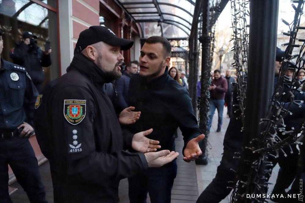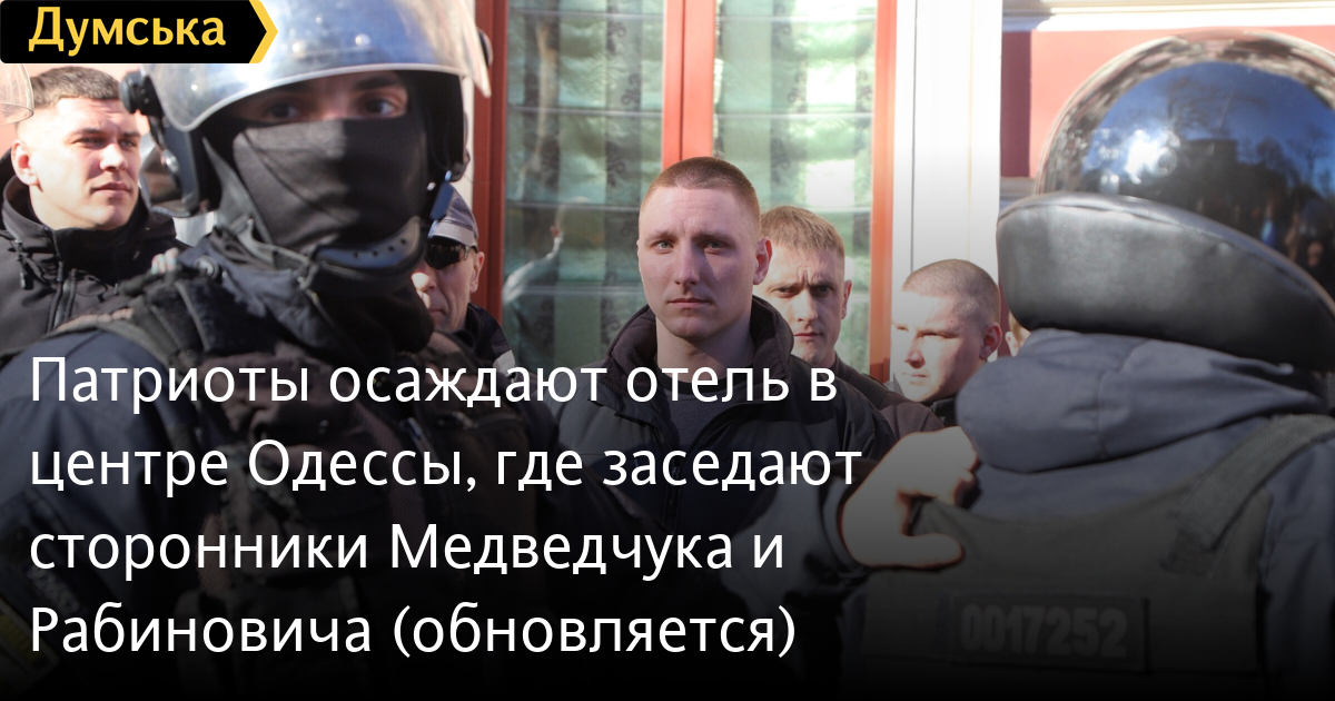 ОБНОВЛЕНО В 15:10. У «Бристоля» стало поспокойнее. Между входом в отель и патриотами стоят люди депутата Богдана Гиганова, сотрудники охранного агентства и полицейские.