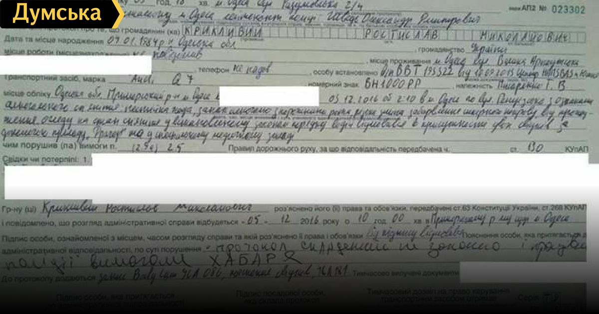 Так, сотрудница полиции Зоя Мельник опубликовала на своей странице в Фейсбуке протокол, составленный на одесского прокурора Ростислава Крикливого (сына депутата Одесского горсовета Николая Крикливого).