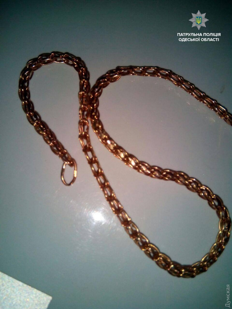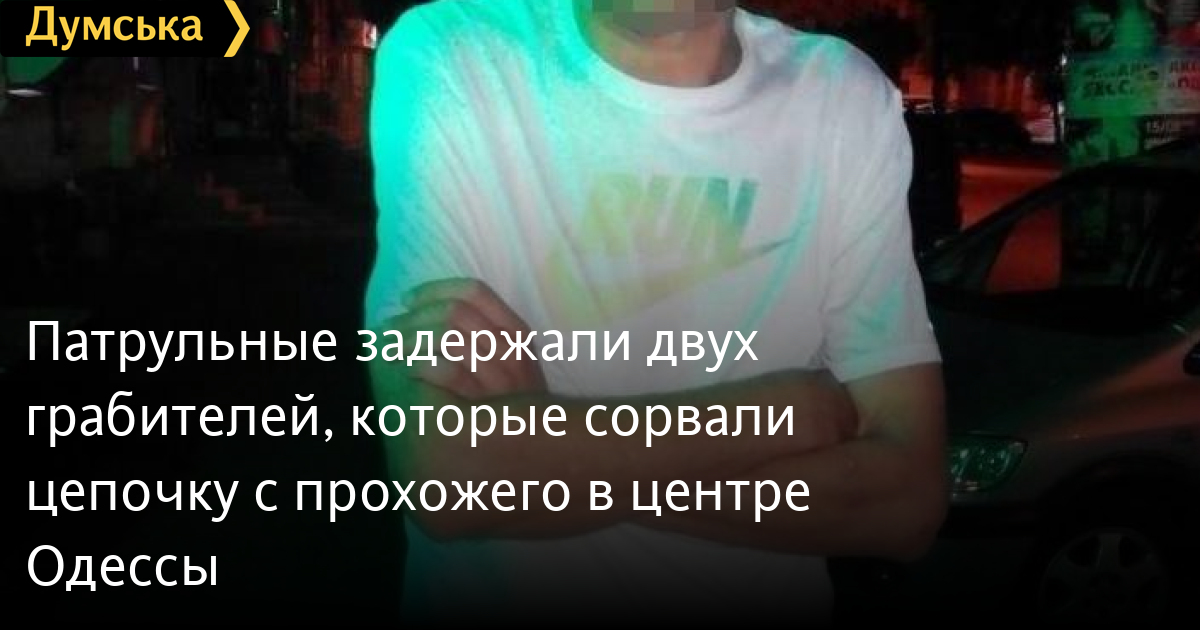 Сегодня около часа ночи в дежурную часть управления патрульной полиции в Одесской области поступила ориентировка на задержание двух мужчин, которые открыто завладели золотой цепочкой прохожего в Приморском районе.
