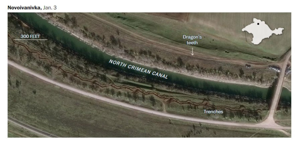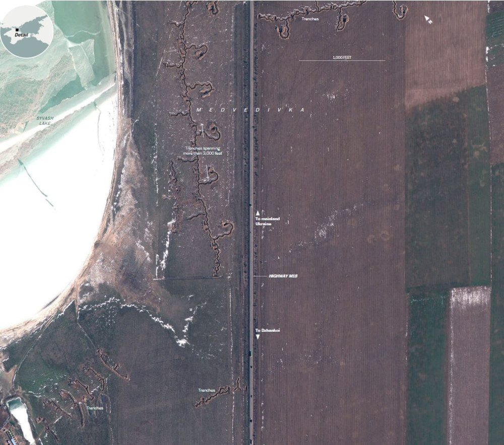 «Після кількох тижнів розкопок територія навколо невеликого міста Медведівка, що розташоване неподалік від переходу на материкову Україну, вкрита складною системою траншей завдовжки в кілька кілометрів. Проходи прорізані в землі під кутом, щоб солдати могли вести вогонь з більшої дальності. Поруч знаходяться інші укріплення, зокрема глибокі рови, призначені для блокування танків та іншої важкої техніки», — зазначає американська газета.