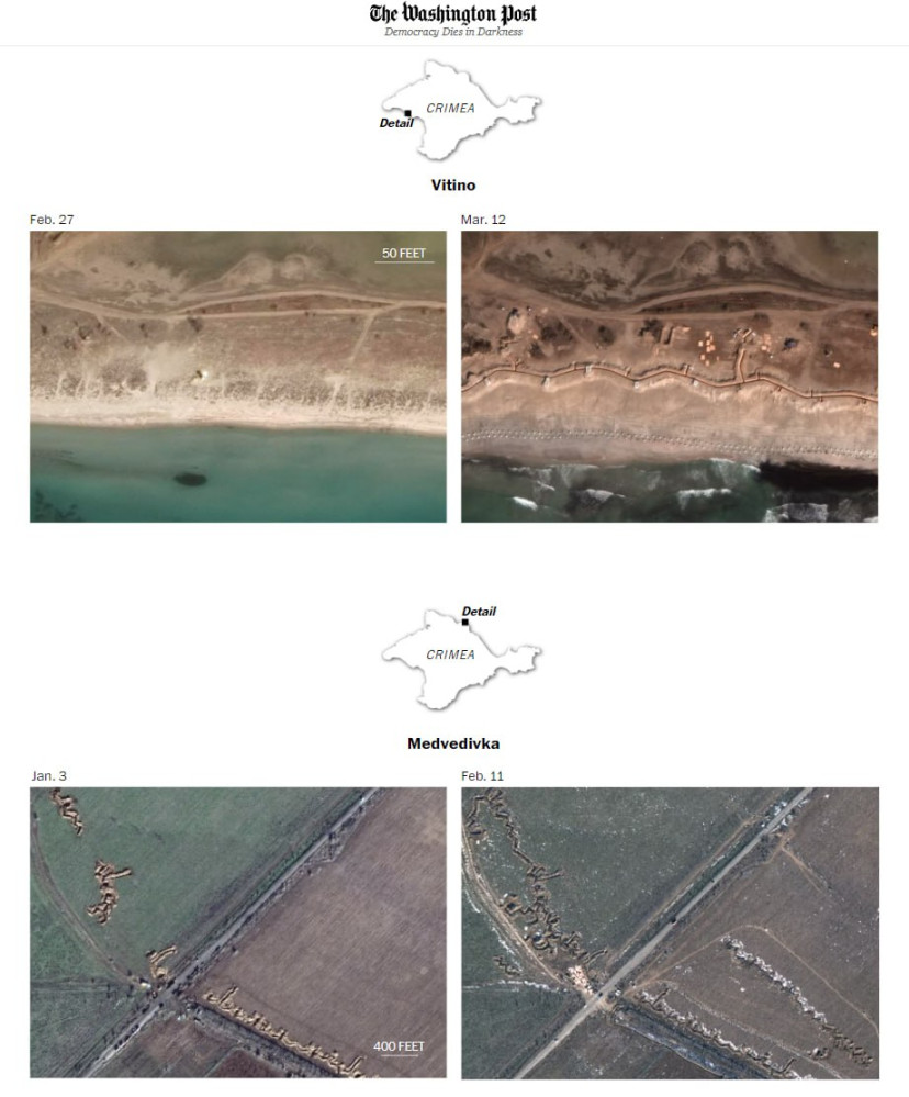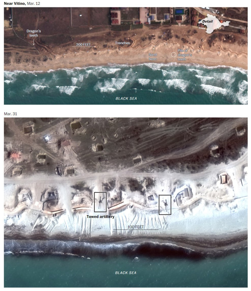 «Оборонні споруди зводяться швидко, напередодні очікуваного весняного наступу України, — продовжує The Washington Post. — Всього за кілька тижнів росія побудувала кілометри укріплень біля Вітіно, міста на західному узбережжі Криму, хоча аналітики кажуть, що десантування малоймовірне».
