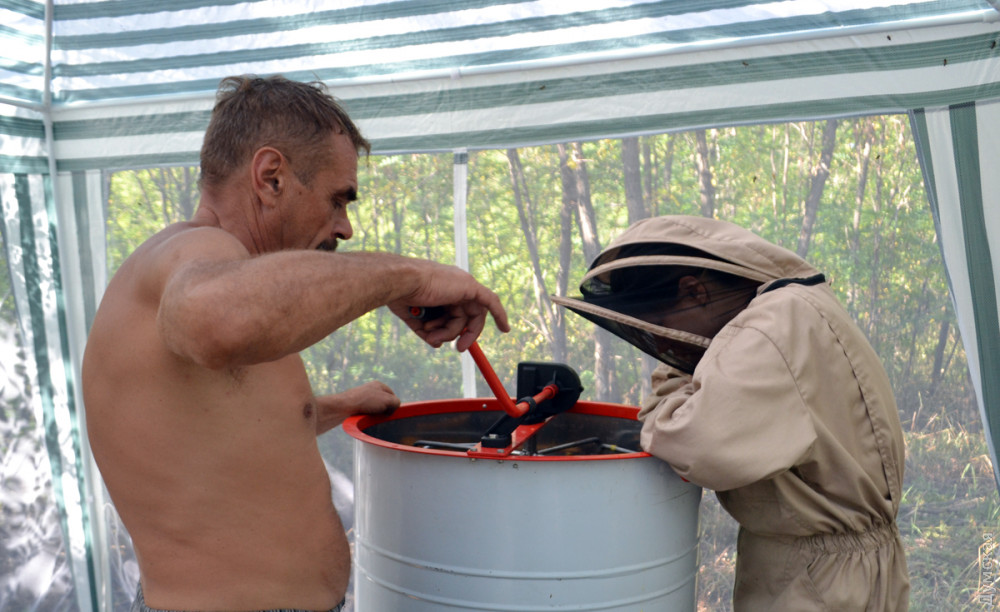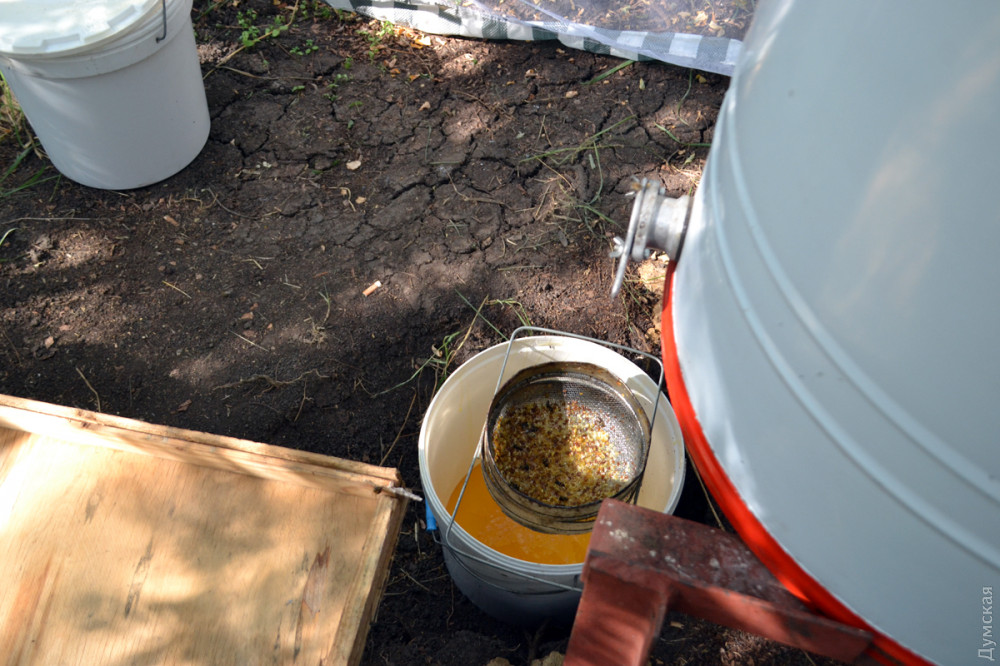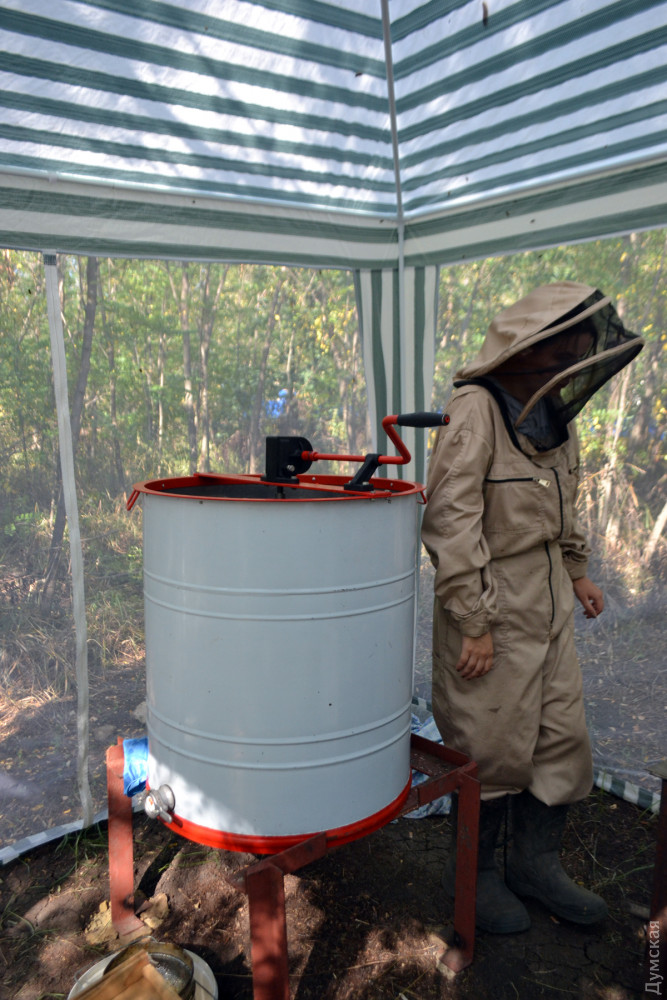 Отдельная палатка с огромной бочкой внутри. Рядом с ней – обнаженный по пояс напарник пасечника. Лоснясь потом, мужчина крутит ручкой некий механизм, к нижним шестерням которого цепляют рамки с сотами. Под действием центробежной силы мед из сотов вылетает наружу и стекает в бочку. Далее мед фильтруется – это и есть конечный продукт.