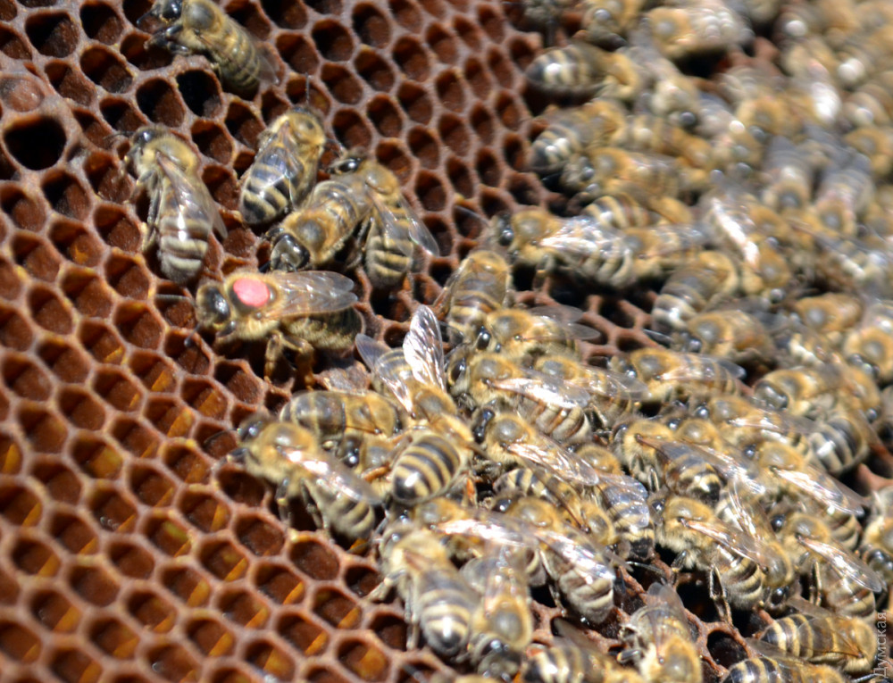В центре каждой пчелиной семьи-роя — королева-мать, матка. На спинке у нее цветная метка, сделанная лаком для ногтей, — это такое клеймо, чтобы матку можно было отличить от остального роя и других маток. Иногда метка номерная.