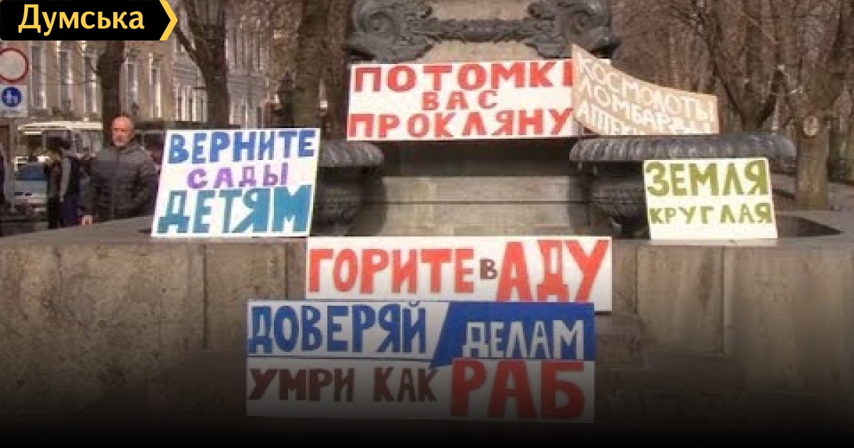 Поверніть сади дітям. Сесії міськради передував мітинг. На Думській площі зібралися близько 150 людей. Одесити виступили проти забудови зелених зон та курортних територій. Мова йде, зокрема, про ділянки на Французькому бульварі.