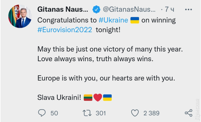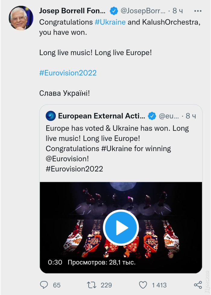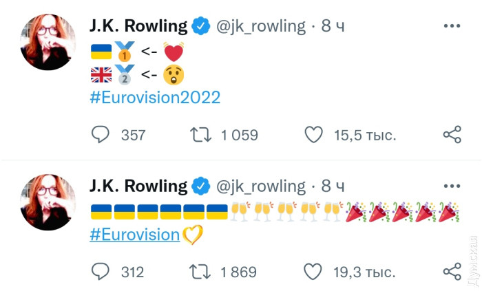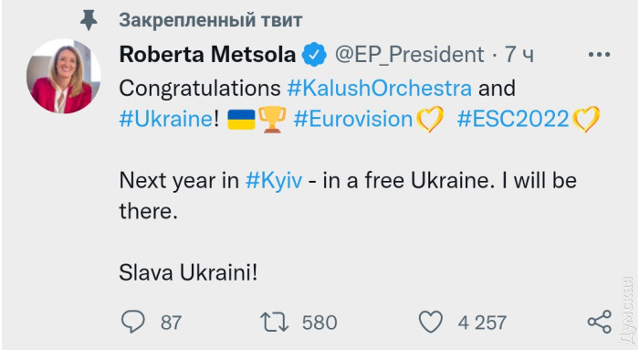 Поздравления мировых лидеров и реакция соцсетей на украинский триумф на ЕвровиденииПосле победы Украины на песенном конкурсе «Евровидение-2022» многие мировые лидеры поспешили поздравить нашу страну. А соцсети, как водится, отреагировали забавными мемами. Первым поздравил группу Kalush Orchestra президент Украины Владимир Зеленский. Он пообещал, что однажды гостей и участников «Евровидения» примет свободный, мирный и отстроенный Мариуполь. «Наше мужество поражает мир, наша музыка покоряет Европу! В следующем году Украина будет принимать «Евровидение»! Третий раз в своей истории. И верю — не в последний раз. Уверен, не за горами наш победный аккорд в битве с врагом», — подчеркнул Зеленский. С победой украинцев поздравили и глава Еврокомиссии Урсула фон дер Ляйен. «Ваша песня покорила наше сердце. Мы празднуем вашу победу во всем мире. ЕС с вами», — отметила она. Не остался в стороне и премьер-министр Великобритании Борис Джонсон, отметив, что победа Украины, «это яркое отражение не только вашего таланта, но и непоколебимой поддержки вашей борьбы за свободу!». Поздравил Kalush Orchestra и Украину с победой Высокий представитель ЕС по вопросам внешней политики и политики безопасности Жозеп Боррель. «Да здравствует музыка! Да здравствует Европа! Слава Украине», — написал он. Президент Еврсовета Шарль Мишель выразил надежду, что в следующем году Евровидение пройдет в Киеве «в свободной и соборной Украине». Президент Европейского парламента Роберта Мецола пообещала, что в следующем году обязательно посетит песенный фестиваль «в свободной Украине», подкрепив свою поддержку словами «Слава Украине»! Президент Литвы Гитанас Науседа пожелал, чтобы победа на Евровидении стала лишь одной из многих побед в этом году. «Любовь всегда побеждает, правда всегда побеждает. С вами Европа, с вами наши сердца», — написал он. Президент Эстонии Карис заявил, что европейцы голосовали и теперь ждут следующего фестиваля в Украине. Британская писательница, автор книг о «Гарри Поттере» Джоан Роулинг выразила свою приверженность Украине смайлами в виде украинских флагов. Напомним, что коллектив Kalush Orchestra исполнил на конкурсе песню Stefania, которую солист Олег Псюк посвятил своей матери, а также всем украинским матерям, которые спасают своих детей от войны. Песня получила 192 балла от жюри и 439 баллов от зрителей. СМЕРТЬ РОСІЙСЬКИМ ОКУПАНТАМ! Помітили помилку? Виділяйте слова з помилкою та натискайте control-enter |