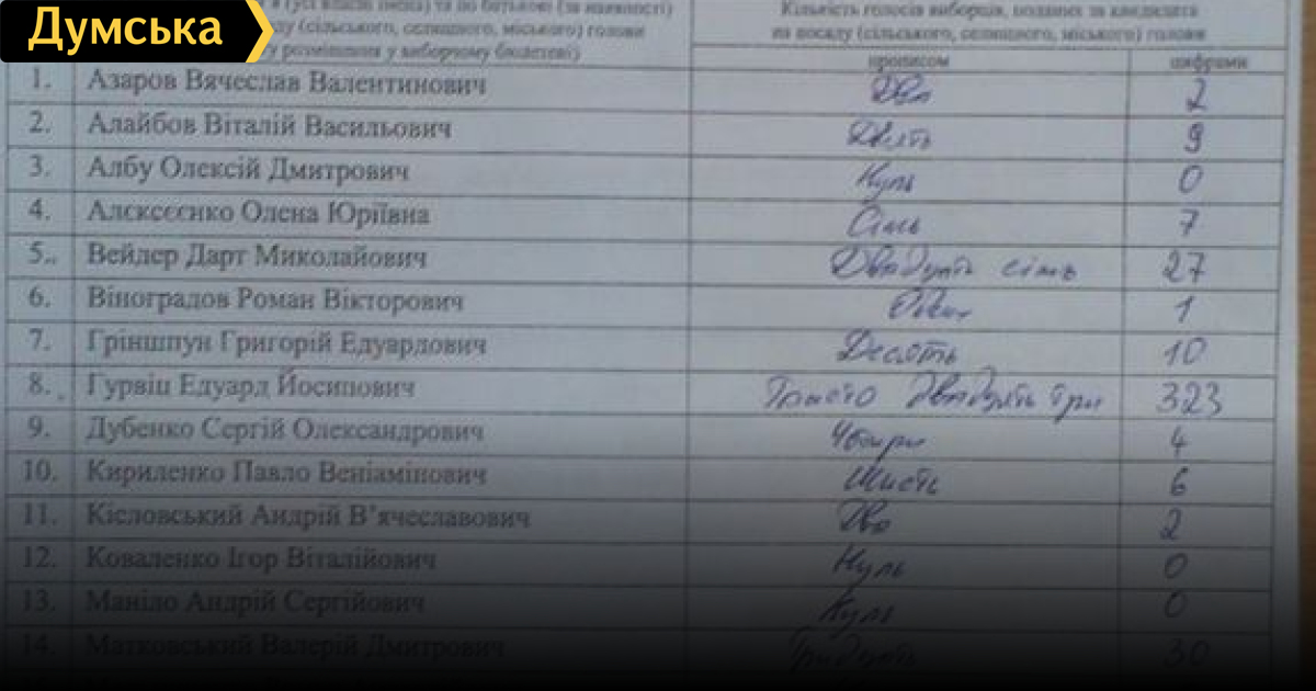 Активист организации «Большая Одесса», который вел трансляцию с участка №511401 (Суворовский район Одессы, ул. Заболотного 35А), обнародовал протокол подсчета голосов на выборах городского головы.