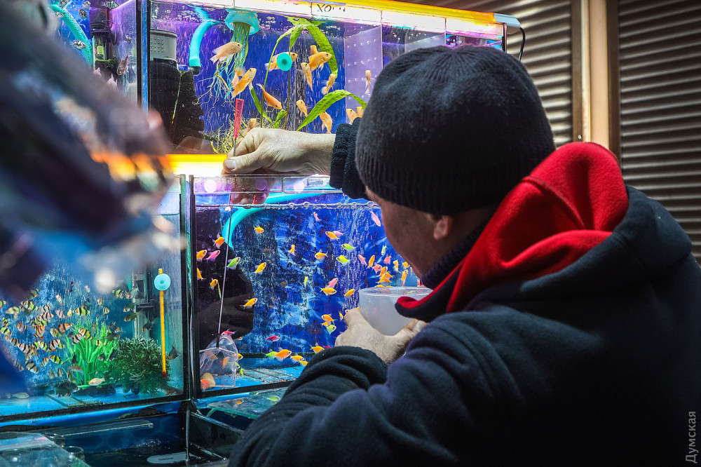 Продавцов рыбок немного, но они есть. Можно купить и корм, и аквариумные растения. Мужчина выбирает для стоящего рядом внука разноцветных тернеций.
