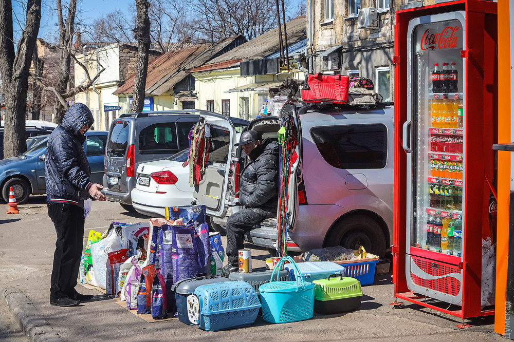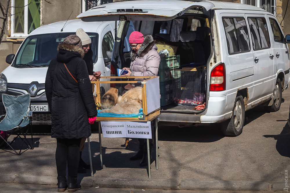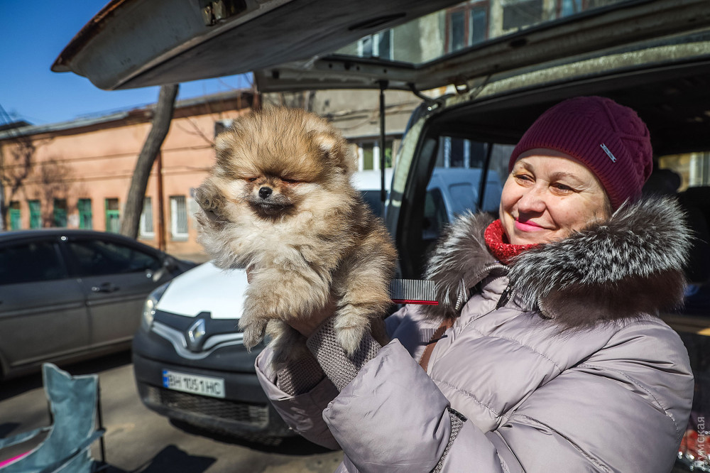 Рядом торгует шпицами и болонками заводчица Светлана. Одесситка распродает щенков, которых не успела отправить за границу и жалуется, что приехавший в Одессу гуманитарный груз с кормами для животных, так и не добрался ни до приютов, ни до большинства питомников.