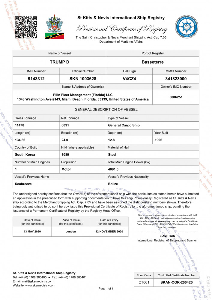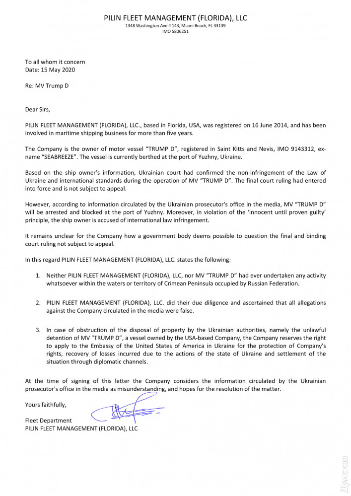 Сразу после того, как судья Дерус вынес определение о снятии ареста, сухогруз продали американской фирме PILIN FLEET MANAGEMENT (FLORIDA), LLC., зарегистрированной в 2014 году во Флориде. Новые собственники переименовали судно в честь президента США - теперь оно гордо называется TRUMP D - и подняли на нем вместо белизского флаг Федерации Сент-Китс и Невис. Правда, покинуть Украину это ему пока не помогло.