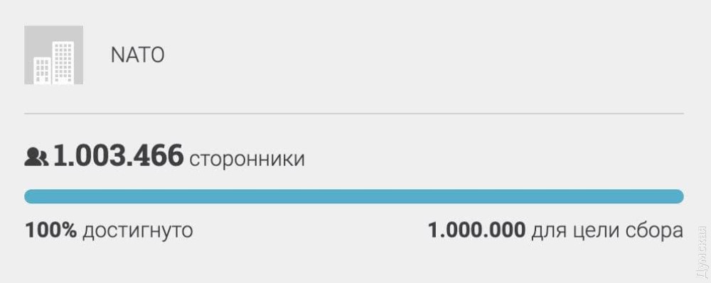 Один миллион — это количество голосов, необходимых для рассмотрения петиции руководством Альянса. На сбор миллиона подписей у украинцев и сочувствующих из других государств ушло всего два дня.
