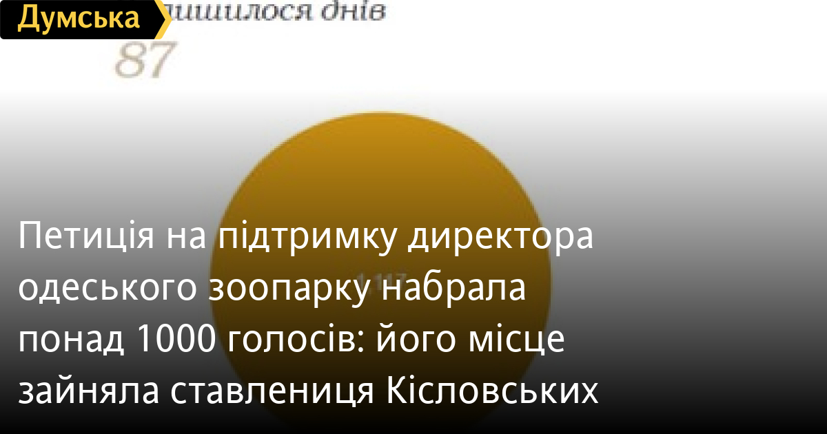 Петиція на підтримку директора одеського зоопарку набрала понад 1000 голосів: його місце зайняла ставлениця КісловськихПонад тисячу голосів набрала петиція на підтримку звільненого напередодні директора одеського зоопарку Ігоря Білякова. Як повідомляє кореспондент «Думської», збір підписів розпочався ще 13 квітня, понад 800 голосів було зібрано за останню добу.