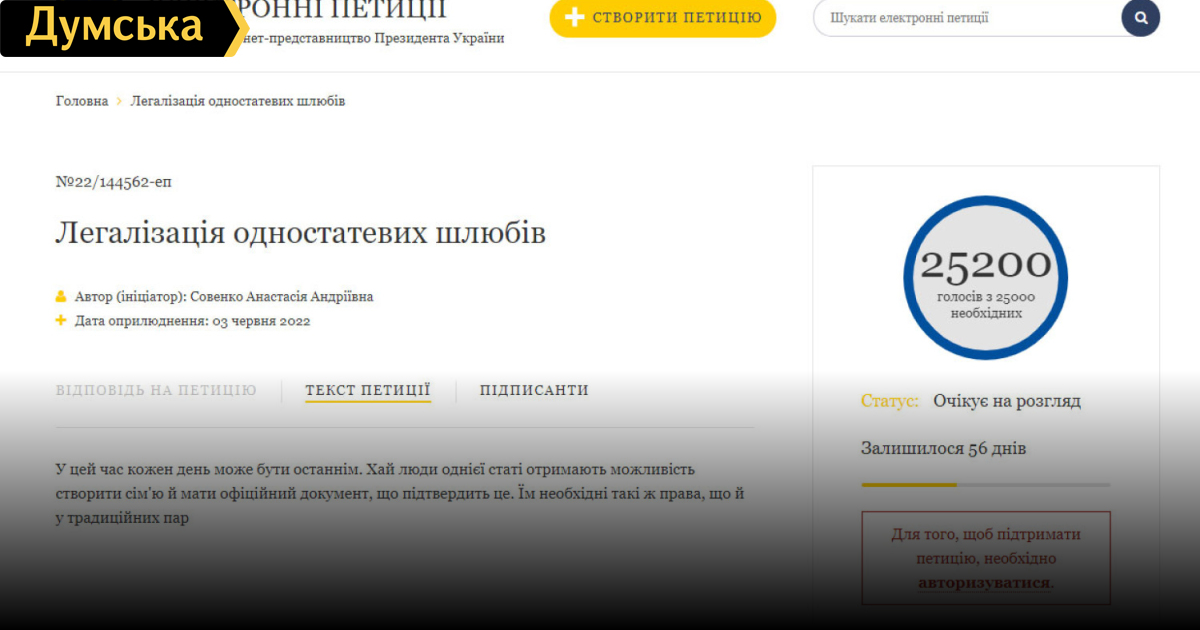 Петиция о легализации однополых браков набрала необходимое количество голосов: дело за ЗеленскимПетиция с призывом легализовать однополые браки в Украине собрала необходимые 25 тысяч голосов. Теперь этот вопрос должен рассмотреть президент Владимир Зеленский. «В настоящее время каждый день может быть последним. Пусть люди одного пола получат возможность создать семью и иметь подтверждающий официальный документ. Им необходимы такие же права, что и у традиционных пар», — написала автор петиции Настя Совенко в описании к своему требованию. Помітили помилку? Виділяйте слова з помилкою та натискайте control-enter