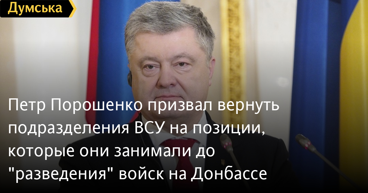 Лидер «Европейской Солидарности», пятый президент Украины Петр Порошенко призвал вернуть подразделения Вооруженных сил Украины на позиции, с которых они были отведены в процессе так называемого «разведения сил» на Донбассе.
