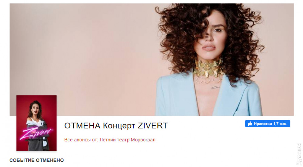Назначенный на сегодня, 24 июля, концерт российской певицы Zivert в Одессе отменен. Также отменено ее выступление в Киеве.