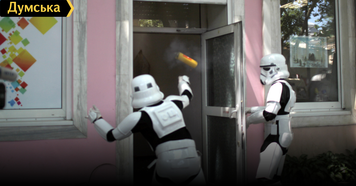 Напомним, сегодня Галактическая Империя нанесла очередной удар по торговцам запрещенными курительными смесями. Между полуднем и 13:00 бойцы отряда спецназначения Имперского штурмового корпуса забросали дымовыми шашками помещение магазина «Круг», продающего наркотики («Думская» писала о нем). В результате расположенная в доме №62 по Пушкинской улице торговая точка сгорела. Кроме того, штурмовики украсили стену здания трафаретным портретом Темного Лорда Дарта Вейдера.