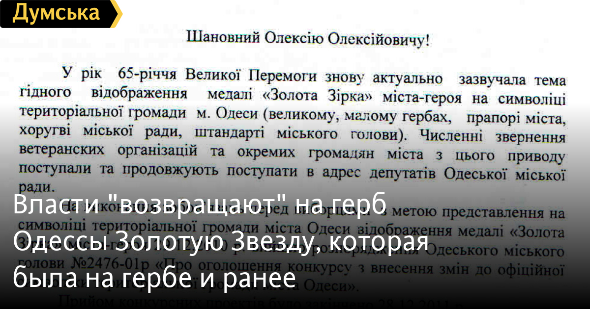 Политическая демагогия вокруг герба Одессы не стихает уже несколько месяцев. Григорий Кваснюк и его однопартийцы добиваются возвращения звезды Героя, которая никуда с герба не пропадала. Так в решении Одесского городского совета №130-XXIII от 29.06.1999, которое никто не отменял, герб города Одесса описан так: