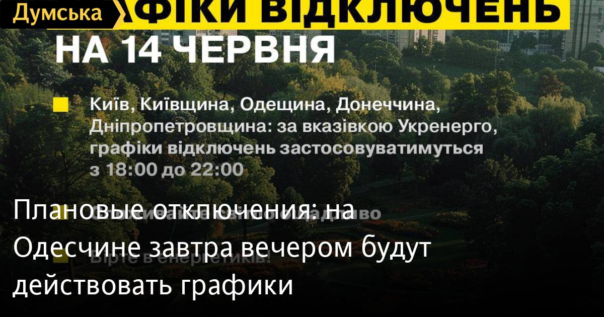 Планові відключення: на Одещині завтра ввечері діятимуть графікиСтабілізаційні графіки відключень світла діятимуть завтра з 18:00 до 22:00. Як повідомили в ДТЕК, 14 червня обмеження торкнуться Одещини, Донеччини, Дніпропетровщини, Київщини та самої столиці. Перевірити, в якій ви групі, та подивитися на свій графік відключень можна тут або в чат-боті ДТЕК у Telegram. СМЕРТЬ РОСІЙСЬКИМ ОКУПАНТАМ! Помітили помилку? Виділяйте слова з помилкою та натискайте control-enter |