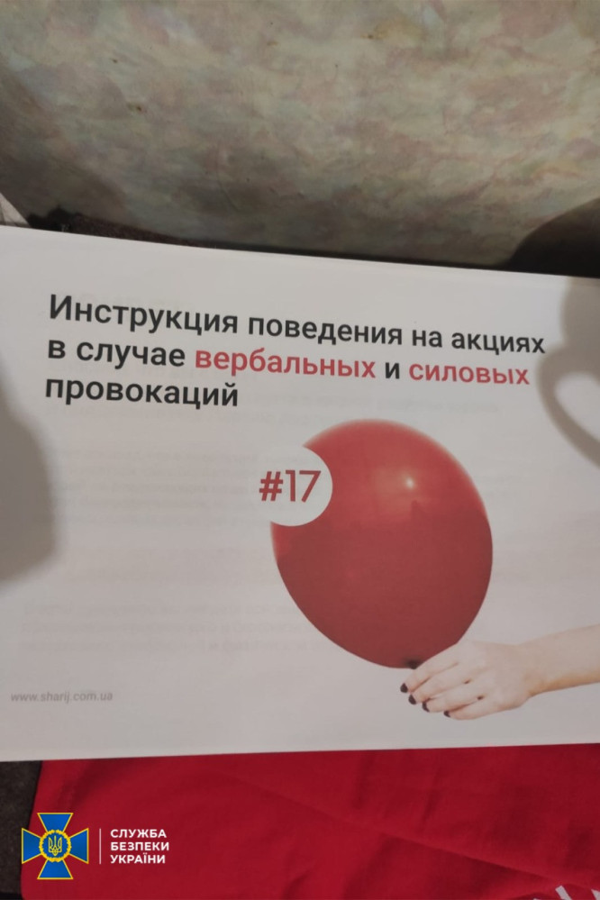 Як повідомили у пресслужбі СБУ, в ході обшуків у приміщеннях прокремлівського осередку виявлено інструкції з алгоритмом дій щодо провокації масових заворушень під час громадських заходів.