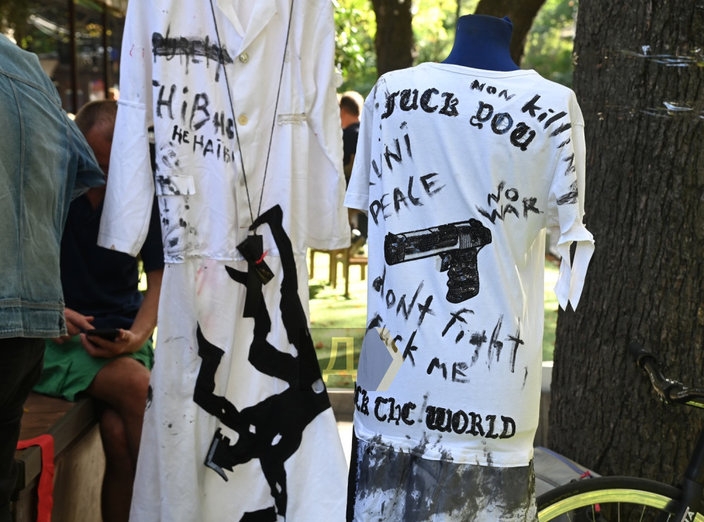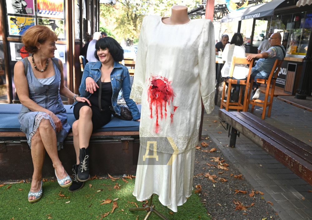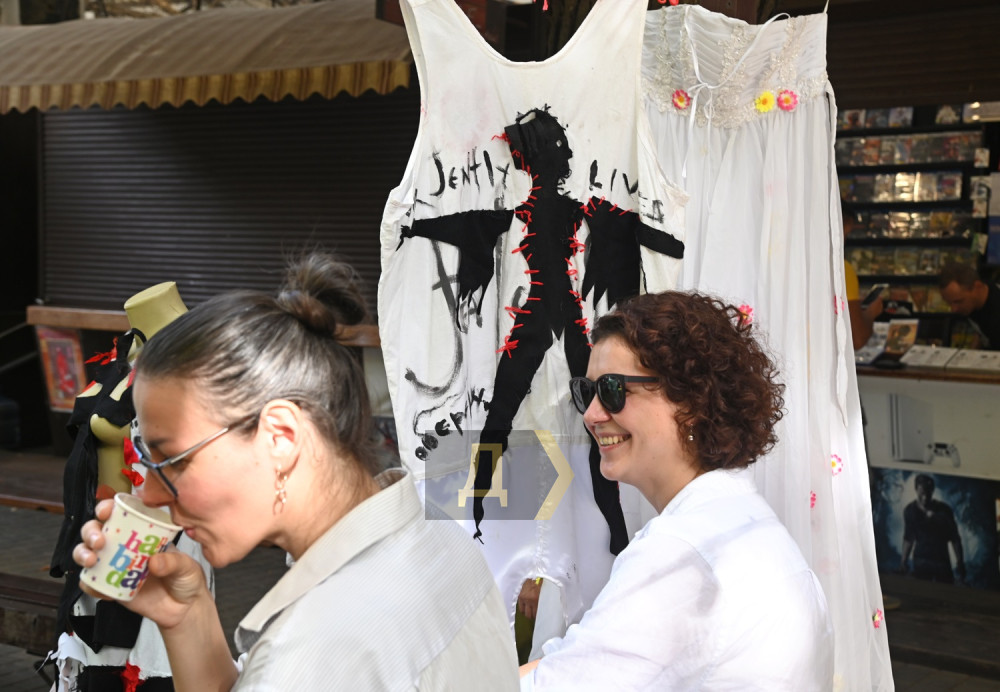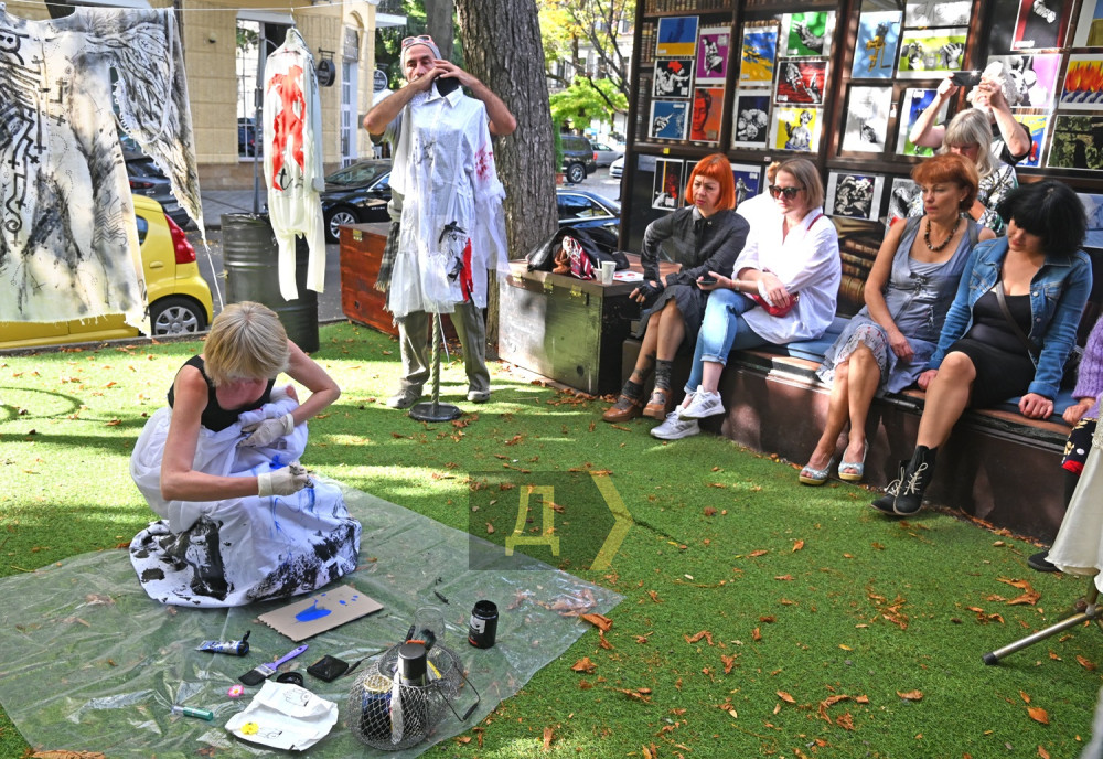 Подвійна акція антивоєнного українського мистецтва відбулася на книжковому ринку, що на Олександрівському проспекті. Цього разу тлом для плакатів стали сукні, а перформер Юліка Ряхіна розмальовувала тканину просто на собі.