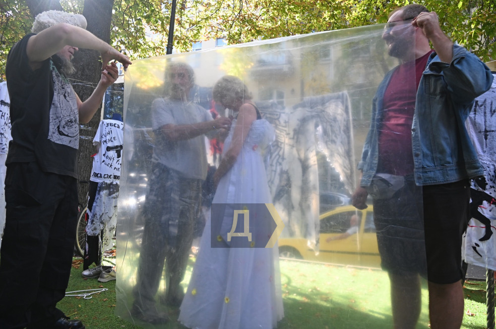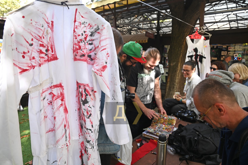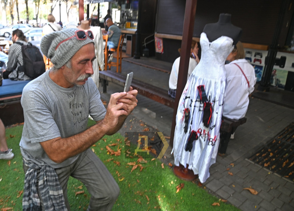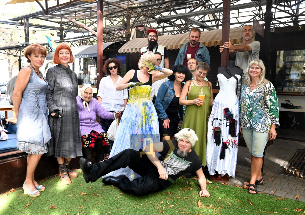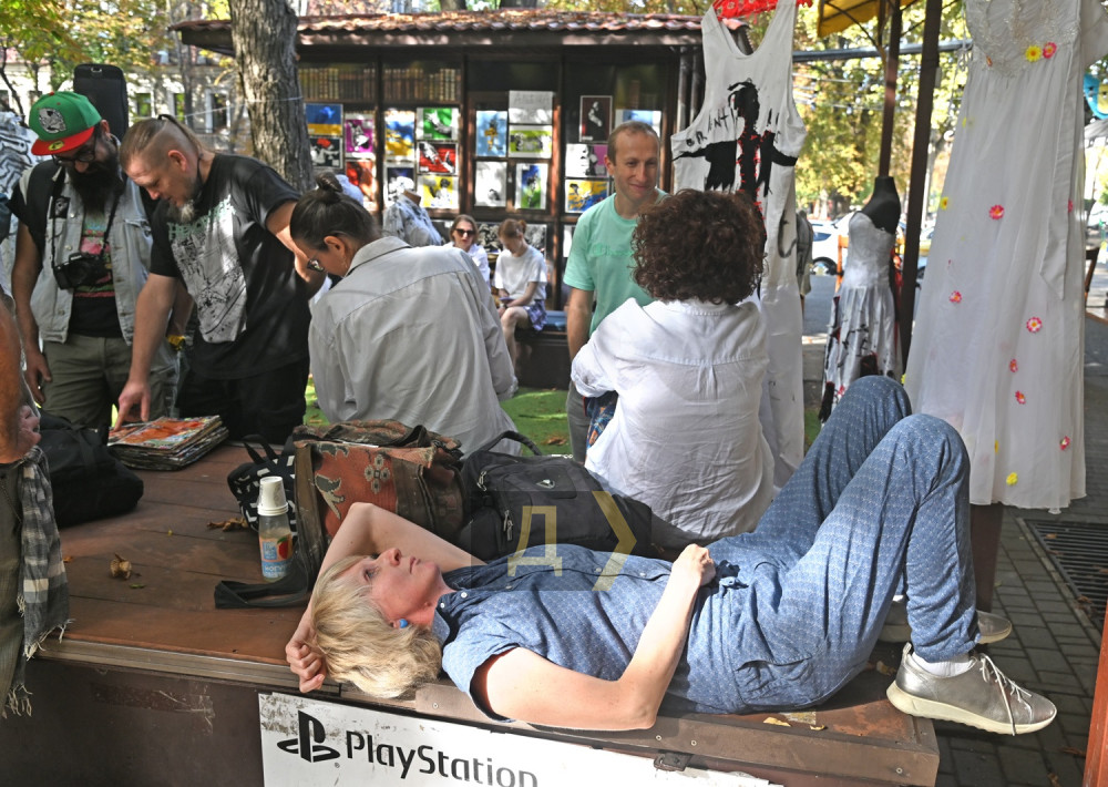 Подвійна акція антивоєнного українського мистецтва відбулася на книжковому ринку, що на Олександрівському проспекті. Цього разу тлом для плакатів стали сукні, а перформер Юліка Ряхіна розмальовувала тканину просто на собі.