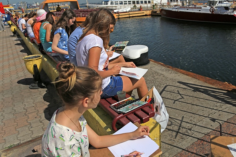 Пленэрное заседание: на морвокзале юные художники учились рисовать море и яхтыСегодня утром причал возле яхт-клуба на морвокзале Одессы заполонили юные художники. Свыше 50 учащихся детской художественной школы №1 имени Костанди пришли на пленэр, чтобы учиться рисовать морские пейзажи. В основном это девушки от 10 до 15 лет, но было и несколько юношей. Все скамейки на нижнем причале у кромки яхт-клуба были заняты рисующими. Преподаватели зорко следили за юными талантами и давали им бесценные наставления. Важно не просто изобразить воду, море и чаек, в задачу входило как можно более подробно передать мелочи, например антенны на яхтах или флаги и вымпелы. Преподаватели пояснили, что это уже не первый выход такого большого количества ребят на пленэр: ранее они творили в зоопарке и Пале-Рояле. Фото Сергея Смоленцева СМЕРТЬ РОСІЙСЬКИМ ОКУПАНТАМ! Помітили помилку? Виділяйте слова з помилкою та натискайте control-enter |