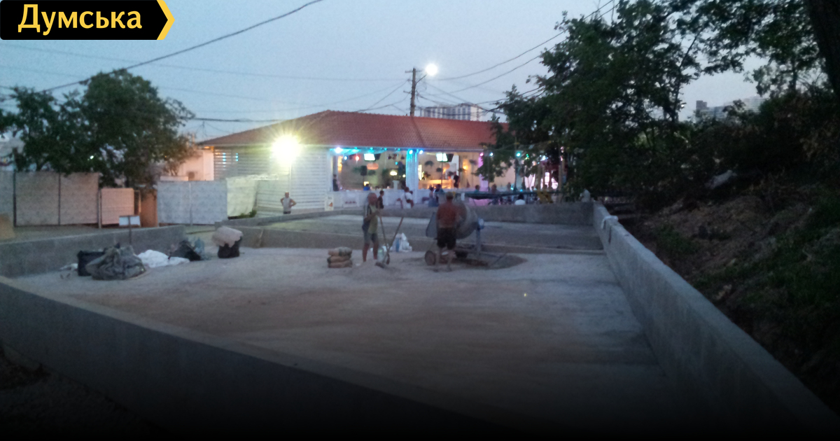 Большая бетонированная площадка появилась напротив пляжа «Портофино» в Аркадии. Как передает корреспондент «Думской», строительство началось совсем недавно. Если верить табличке, вскоре здесь оборудуют детскую площадку.