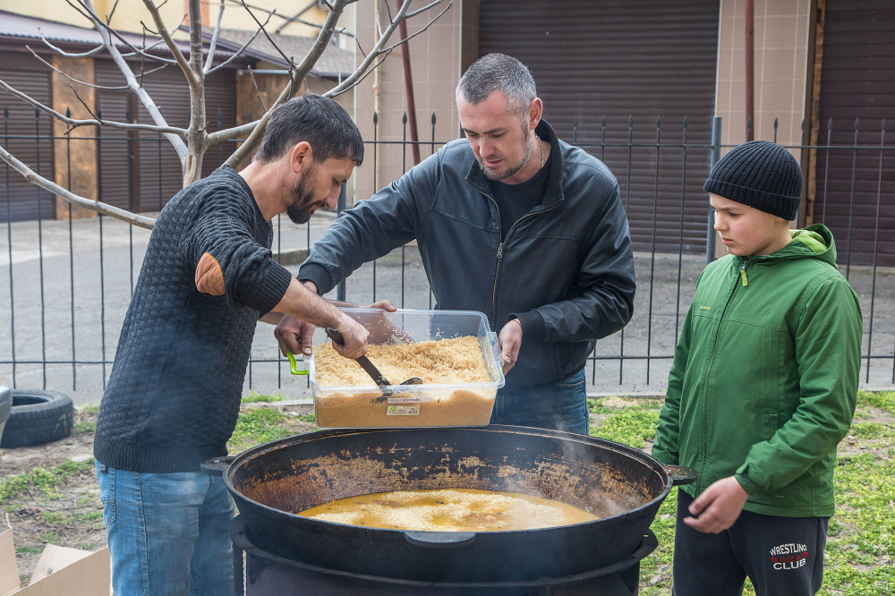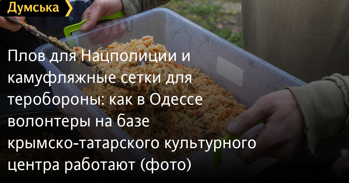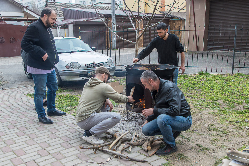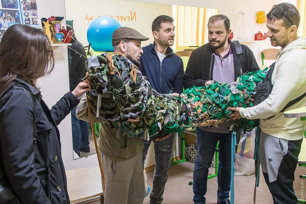 «Самоотдача украинцев вызывает восхищение, — рассказывает Февзи Мамутов. – Ежедневно девушки приходят и плетут сети бесплатно – нам остается только находить ткани и основу. Мы ежедневно готовим для них суп на обед. А с недавних пор решили расширить ассортимент, и готовить еще настоящий плов. Получается с запасом: часть отвозим сотрудникам Нацполиции, часть передаем на блокпосты нашей теробороны».