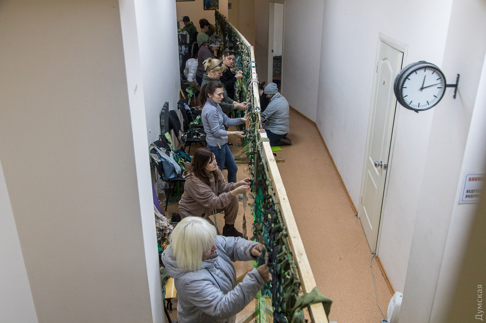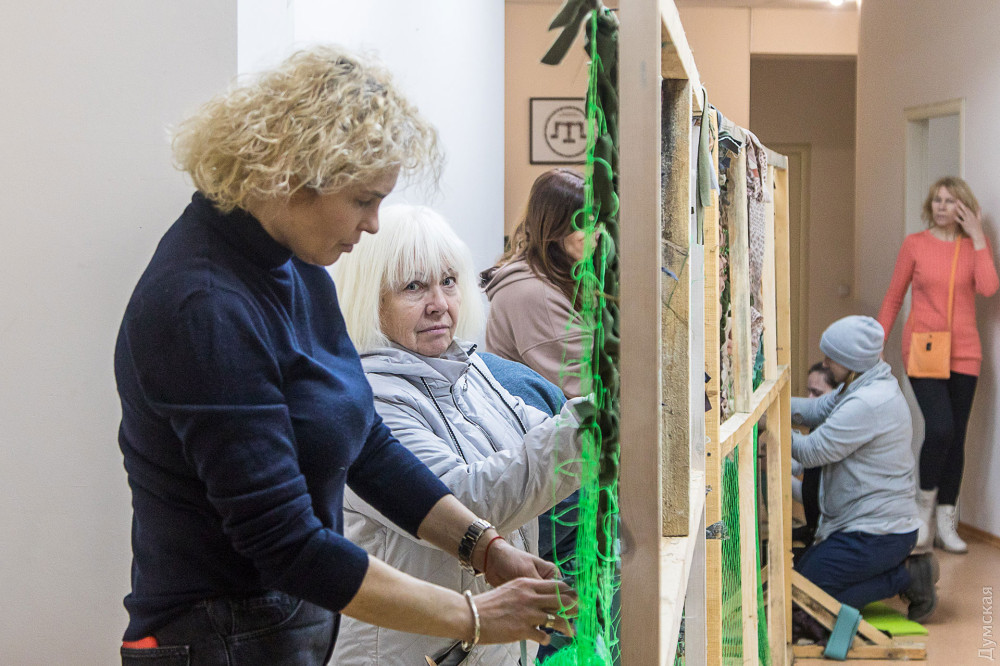 Практически с первого дня войны центр перестроился и начал помогать фронту. Сегодня здесь собирают гуманитарную помощь и плетут камуфляжные сети.
