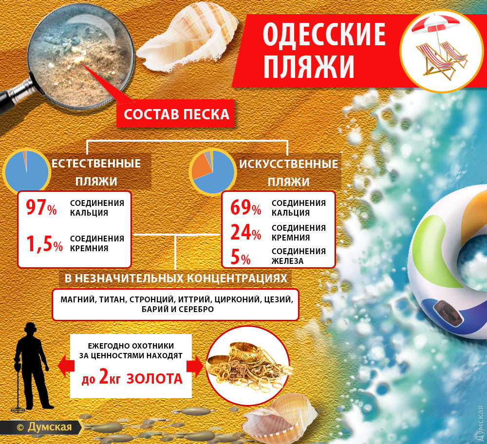 А еще в песке одесских пляжей присутствует золото, причем как в микроскопическом виде, так и целыми предметами. Каждую осень вооруженные металлодетекторами охотники за ценностями находят на побережье, по самым скромным оценкам, до двух килограммов желтого металла. В основном это потерянные сережки и браслетики, хотя встречаются и экзотические штуковины вроде золотых брелоков в виде фаллоса.