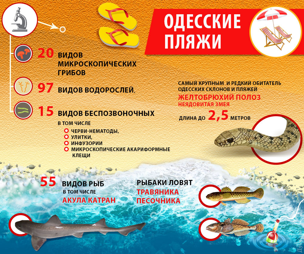 В песке одесских пляжей обитает 20 видов микроскопических грибов, 97 видов водорослей, 15 видов беспозвоночных (в том числе черви-нематоды, улитки, инфузории и микроскопические акариформные клещи).