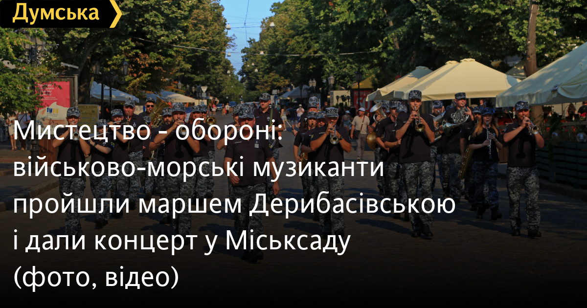 Справжній подарунок одеситам з нагоди Дня Військово-морських сил України зробив флотський творчий колектив — Центр військово-музичного мистецтва ВМСУ. Як повідомляє кореспондент «Думської», шоу розпочалося о 17:00 неділі — командир морських музикантів капітан другого рангу Любомир Сукенник провів свій колектив маршем від Оперного театру до ротонди Міського саду. Дорогою моряки виконували марш ВМС. А потім був великий концерт у Міському саду. Крім оркестру, одеситів майже півтори години розважали солісти вокальної та балетної групи Центру. Звучали традиційні марші з вокальними партіями, українські народні пісні та військова лірика. Одесити підспівували і пританцьовували, а закінчився концерт бурхливими оплесками. Фото та відео Сергія Смоленцева СМЕРТЬ РОСІЙСЬКИМ ОКУПАНТАМ! Помітили помилку? Виділяйте слова з помилкою та натискайте control-enter Новини по цій темі: 28 червня 2025: Одеський інститут Військово-морських сил випустив молодих лейтенантів флоту: найкращою вперше стала дівчина (фото, відео) 19 червня 2025: Командував обороною Одеси та всього півдня України: Сухопутні війська очолив бойовий генерал-танкіст з американською освітою 30 червня 2025: Жінка на кораблі: одеська курсантка несла вахту на авіаносці і вижила на смузі для «суперменів» (фото, відео) |