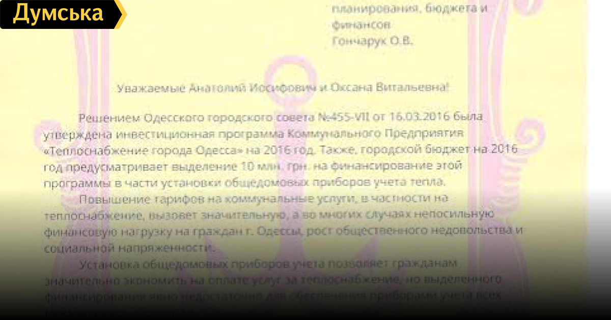 Депутатское обращение с просьбой выделить дополнительное финансирование на установку приборов учета тепла сделал руководитель фракции партии «Солидарность» БПП в Одесском городском совете Олег Каминкер, сообщает пресс-служба партии. Профильные комиссии поддержали обращение.