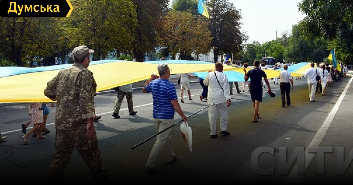Сотни горожан под патриотические речевки и украинские песни в сопровождении сотрудников полиции пронесли стяг от памятника Тарасу Шевченко до Школьного сквера и обратно, пишет портал «Сити».