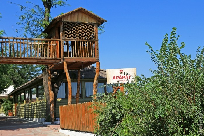 Чуть дальше, на самом обрыве, откуда открывается вид на Аркадию и Итаку, расположился ресторан «Арарат». Хозяева активно завлекают народ наличием национальных блюд и, конечно, видом на море. Правда, вкусно поесть-попить здесь по карману далеко не всякому — даже в ресторанах Аркадии подешевле будет.