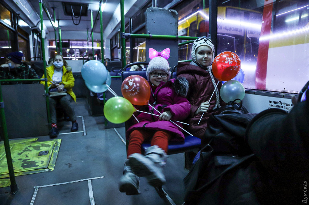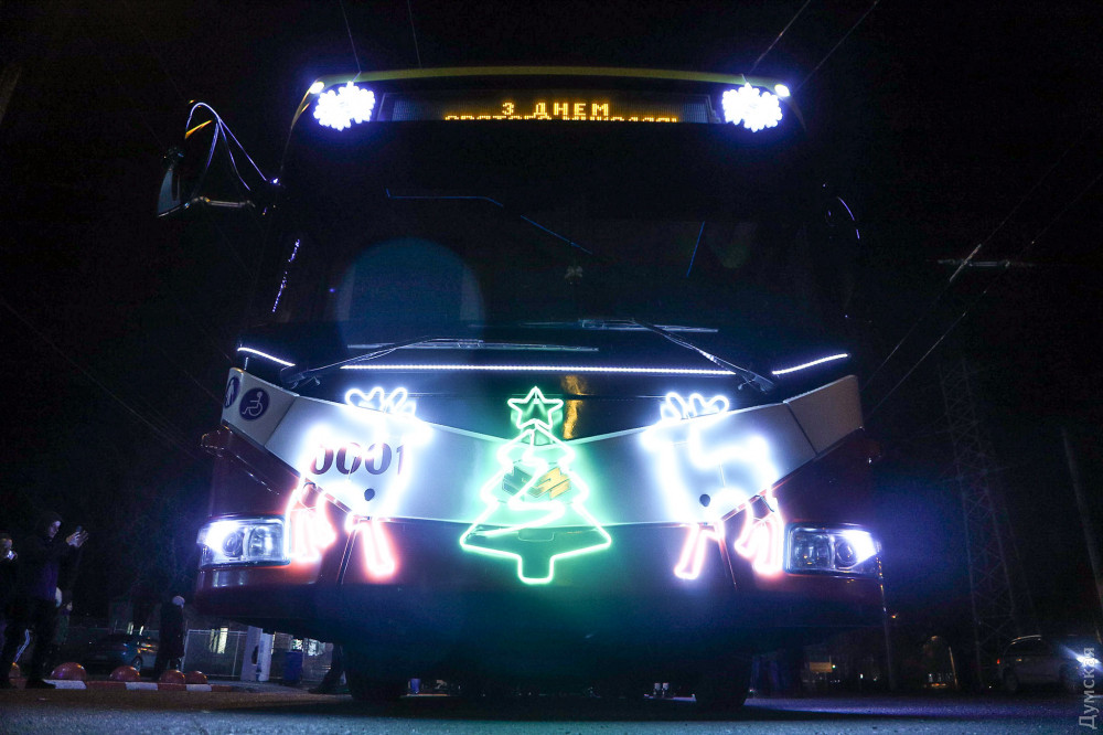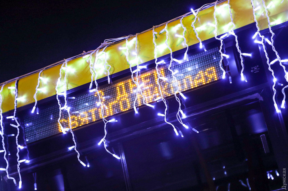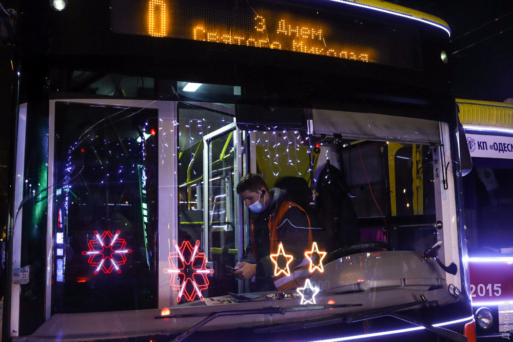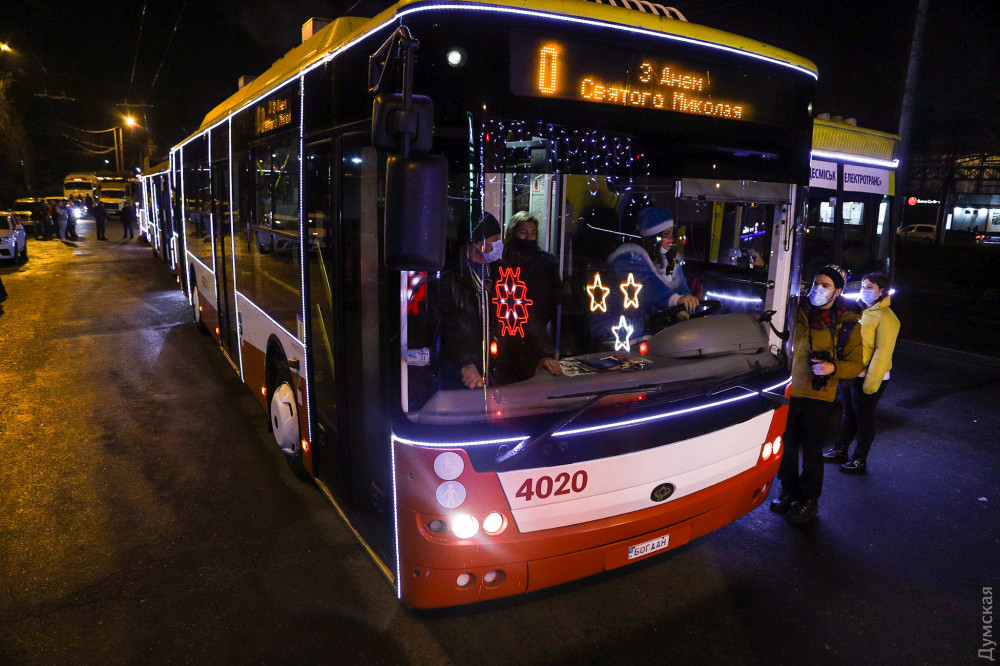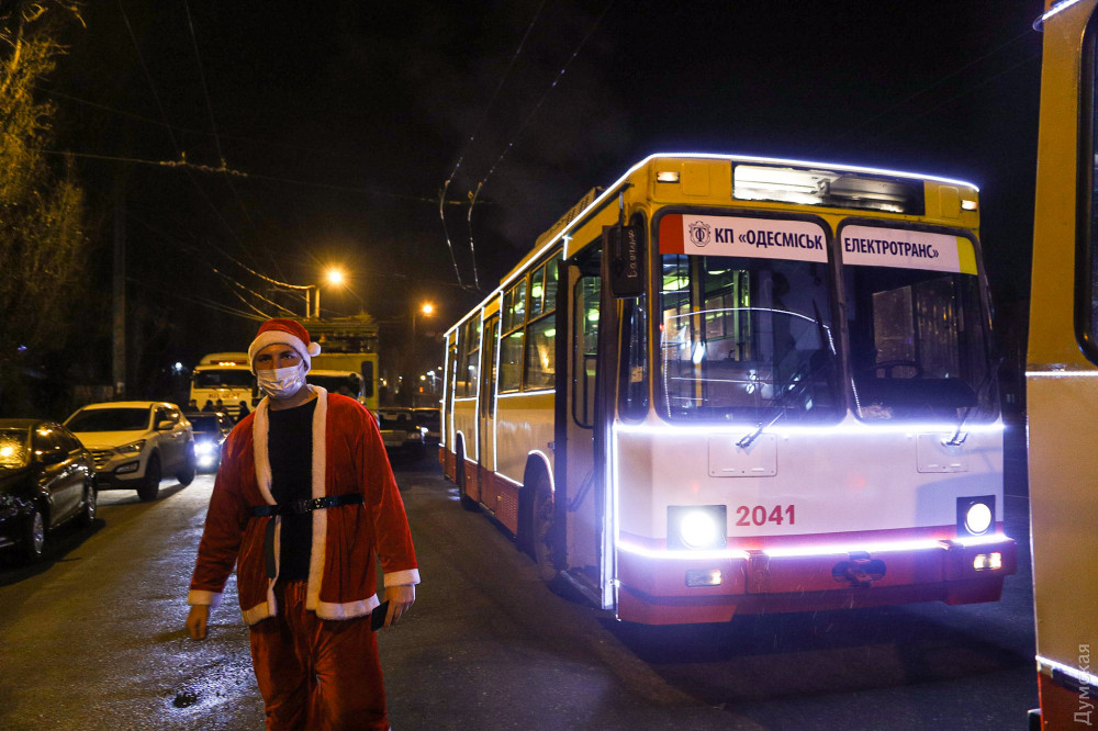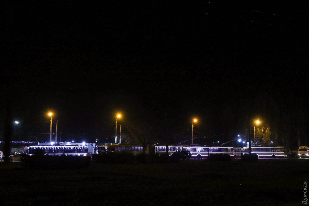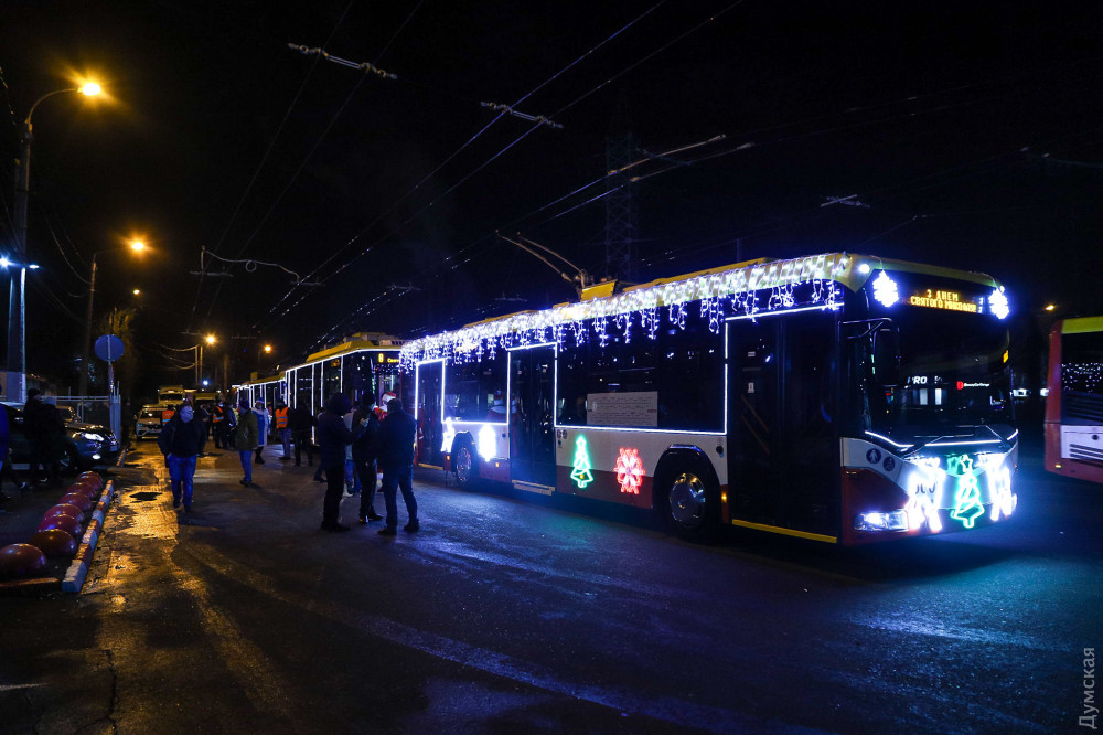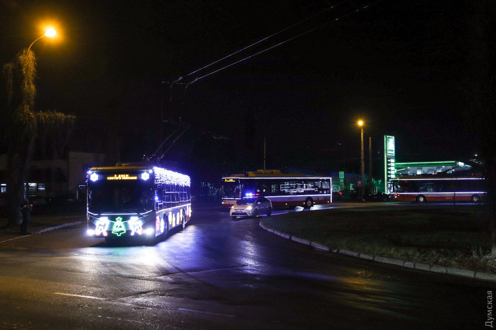 Последнему выпала честь возглавить колонну. БКМ украсили новыми гирляндами, которые меняют цвет, а за руль сел мэтр троллейбусного цеха Сергей Гончар.