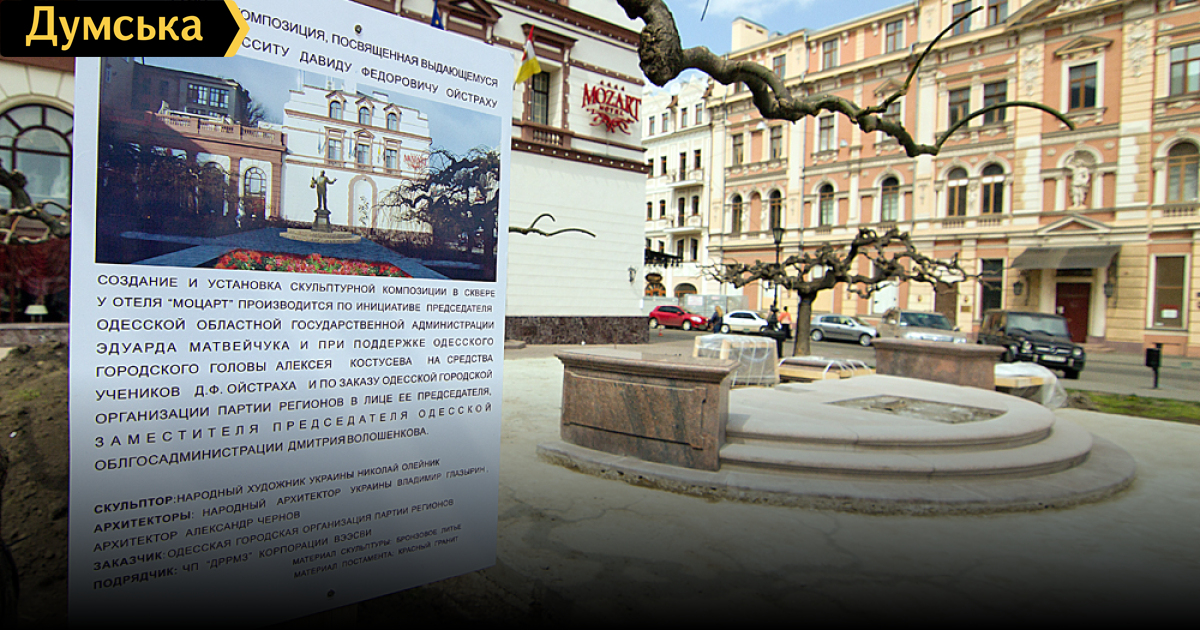 Подготовка Театральной площади к установке на ней памятника музыканту Давиду Ойстраху приостановлена.