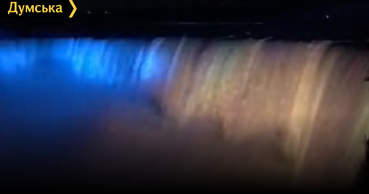 На ролике видно, как крупнейший в мире водопад на границе США и Канады переливается сине-желтыми цветами. Посмотреть на зрелищное шоу пришли сотни людей. За кадром слышно, как они поют гимн Украины и скандируют «Слава Украине!».