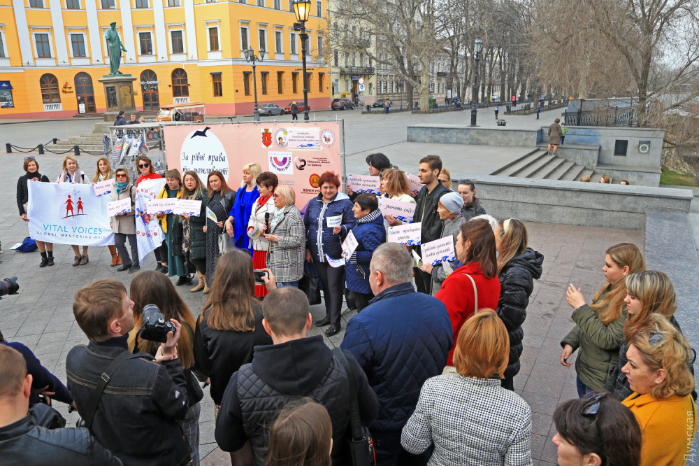 Около тридцати активисток с плакатами и флагами прошли по Приморскому бульвару, Ланжероновской и Дерибасовской. А стартовала акция от памятника Дюку, где марширующие провели митинг, передает корреспондент «Думской».