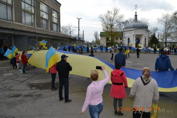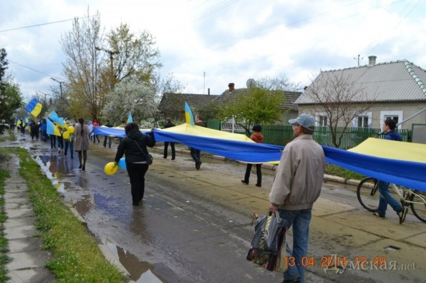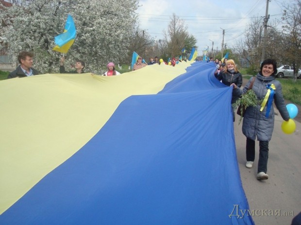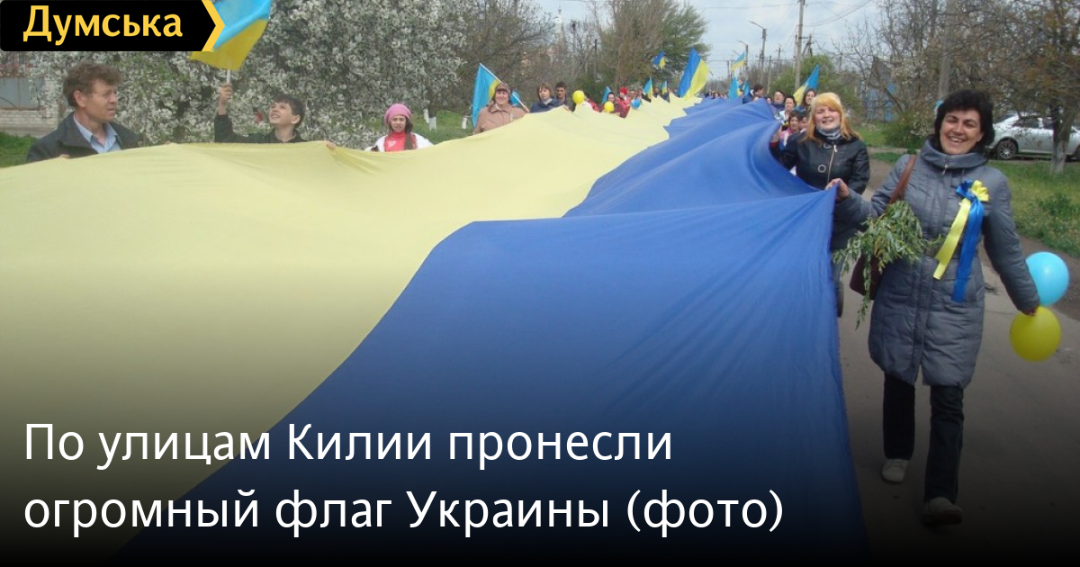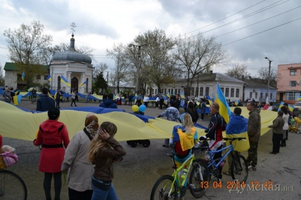 В воскресенье в городе Килия Одесской области прошла акция в поддержку мира и территориальной целостности Украины. Сотни жителей райцентра приняли в ней участие — люди пронесли улицами города огромный флаг Украины.