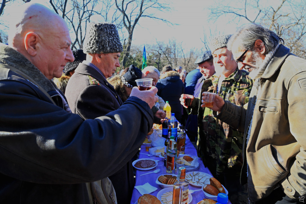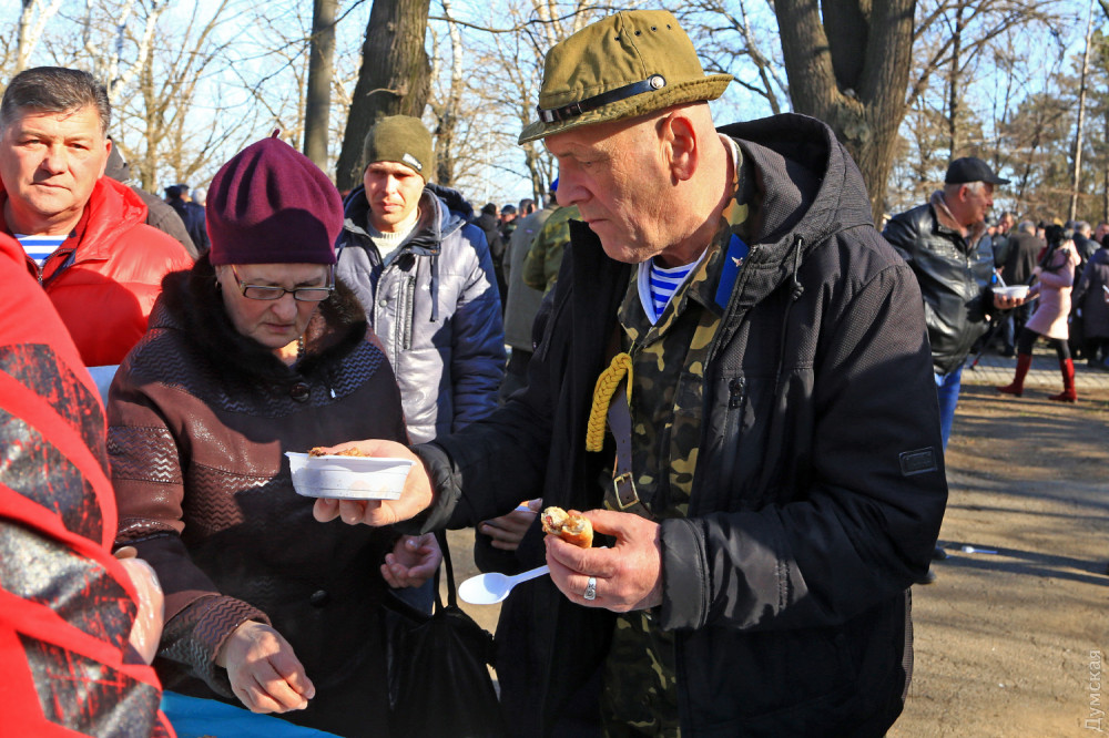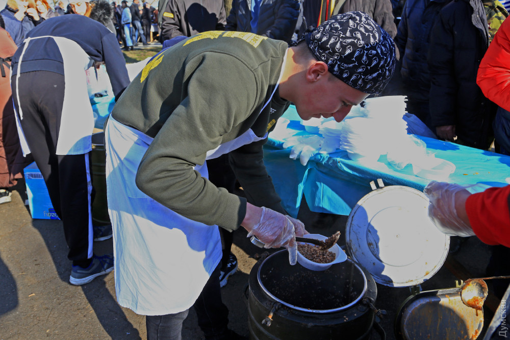 Рядом были расставлены столы с закусками и выпивкой, а полевые кухни раздавали традиционную гречку с тушенкой.