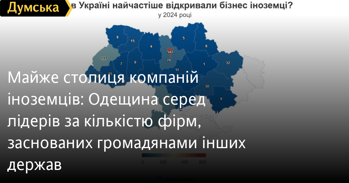 Майже столиця компаній іноземців: Одещина серед лідерів за кількістю фірм, заснованих громадянами інших державОдещина увійшла до трійки лідерів за кількістю відкритих іноземцями компаній, у 2024-му було 122 таких фірми. Обганяють нас тільки Київ (542) і Львівська область (137), пише «Опендатабот». Загалом 2024 року іноземці відкрили в Україні 1 109 нових компаній. Це на чверть менше, ніж у 2023-му. Порівняно з довоєнним рівнем кількість таких бізнесів зменшилася на 60%. Найчастіше фірми реєстрували громадяни Туреччини (201), Польщі (90) та США (89).