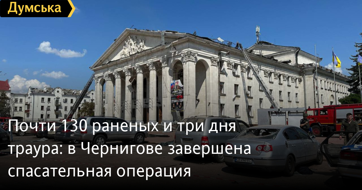 Спасательная операция после ракетного удара оккупантов по драмтеатру в Чернигове завершена. Как сообщили в пресс-службе МВД, в результате атаки пострадали 129 человек. Еще семеро погибли.