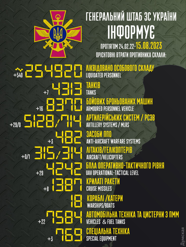 Майже 30 артилерійських систем, три установки ППО та 540 окупантів знищили в Україні за добу540 російських загарбників знищено воїнами Сил оборони 14 серпня. Загальні втрати ворожої армії від початку повномасштабного вторгнення вже становлять 254 тисячі 920 солдатів та офіцерів. Крім того, наші захисники спалили 29 артилерійських систем (5128 за весь час), три установки ППО (482). Збито вертоліт (314), вісім крилатих ракет (1387), 29 безпілотників оперативно-тактичного рівня (4242). Підбито сім танків (4313), 16 бойових броньованих машин (8370), 22 вантажівки та автозаправники (7584), три одиниці спецтехніки (769). СМЕРТЬ РОСІЙСЬКИМ ОКУПАНТАМ! Помітили помилку? Виділяйте слова з помилкою та натискайте control-enter |